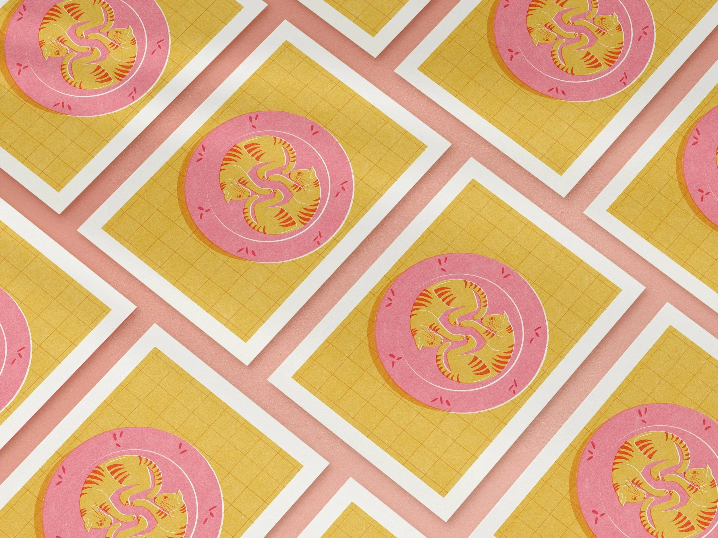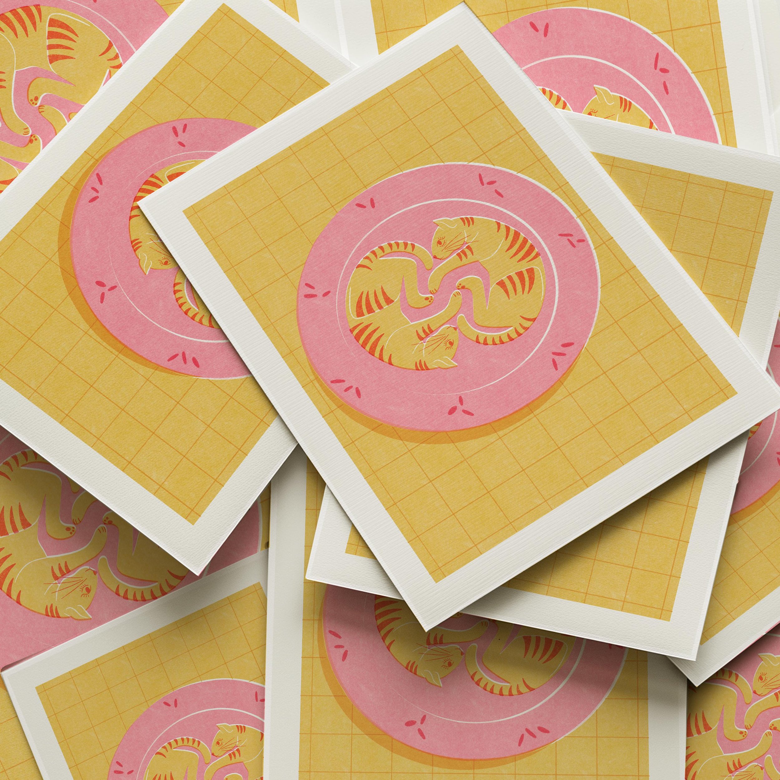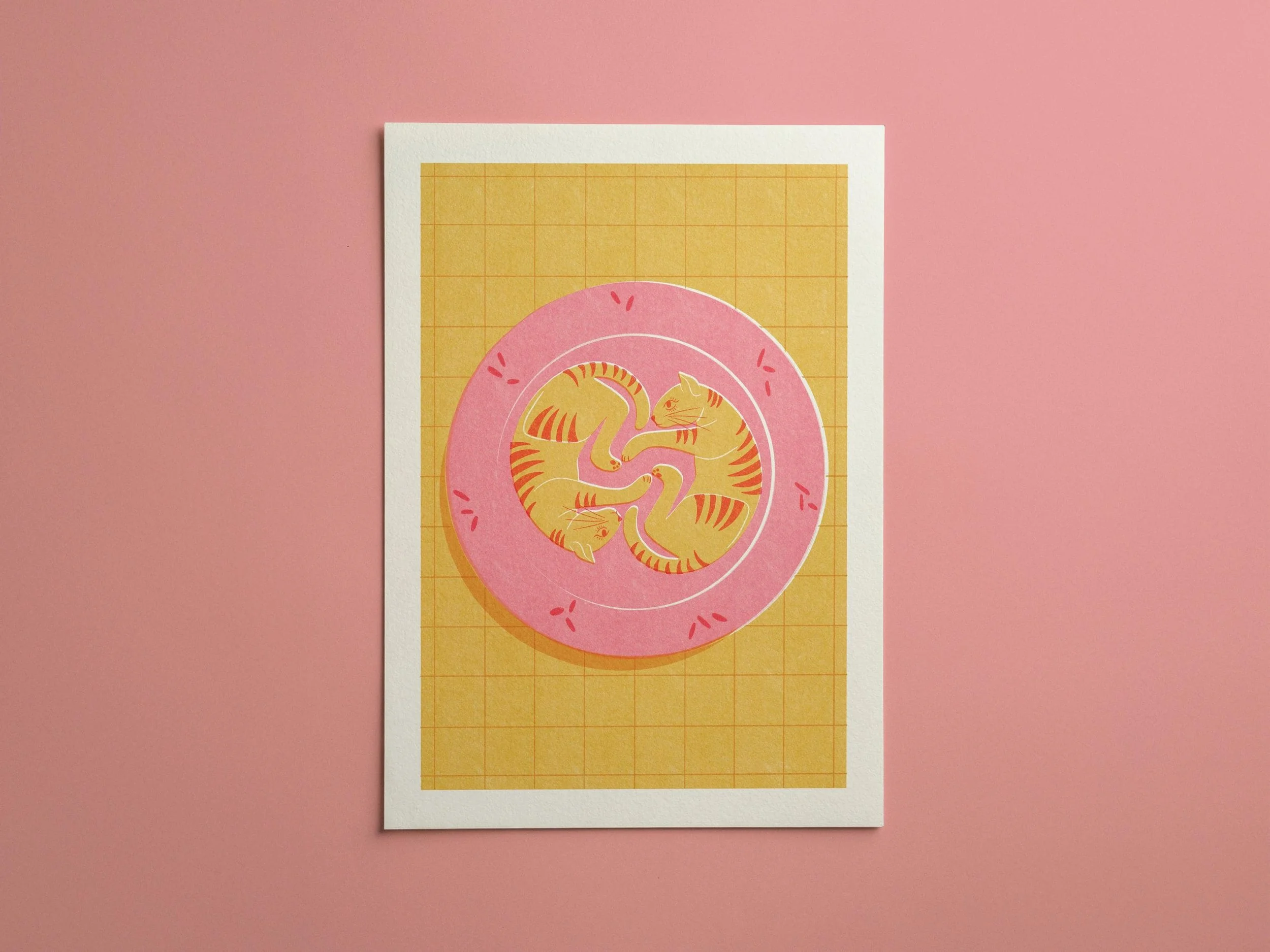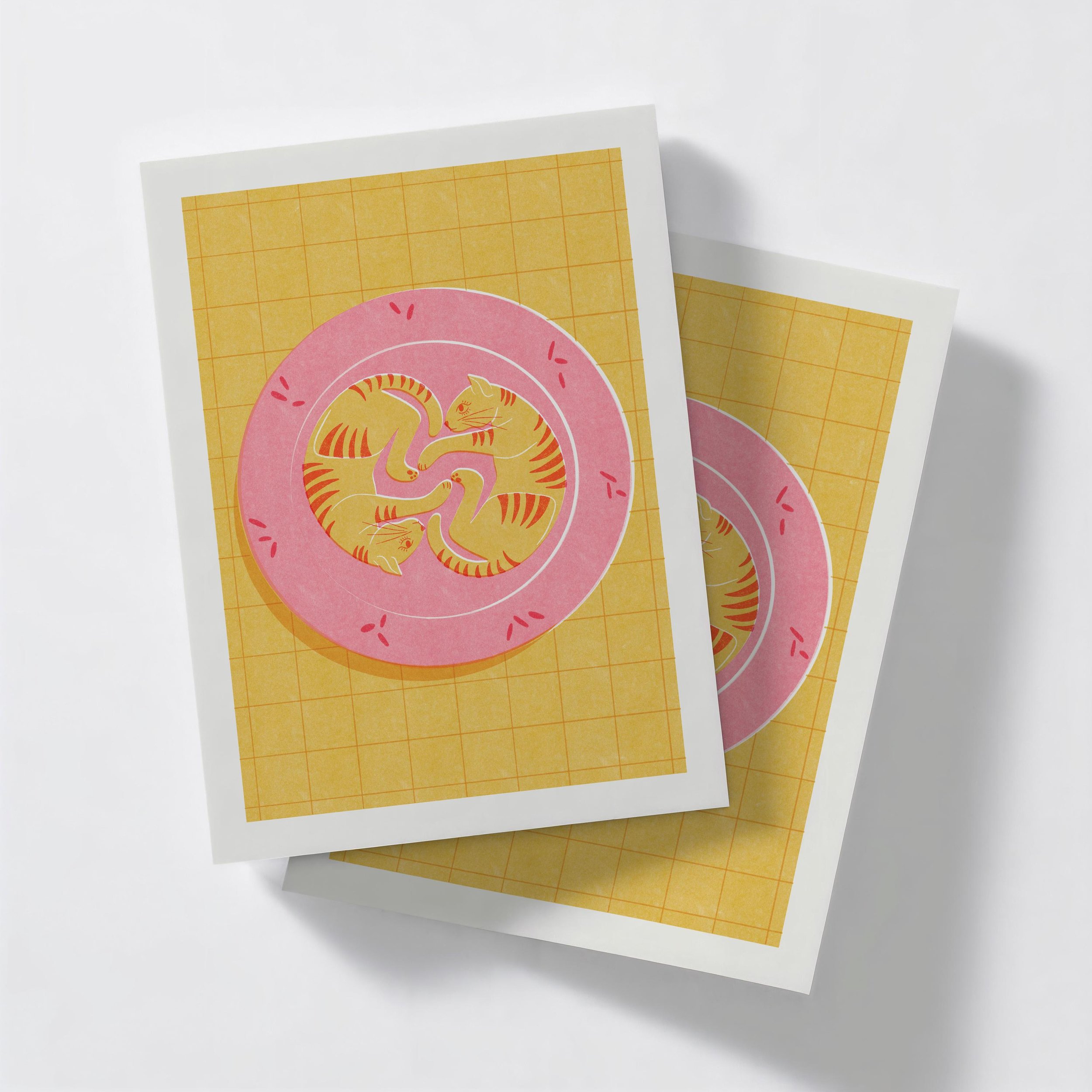 Featuring two snuggled-up cats in a soft pink bed on a warm yellow grid, this risograph-style illustration is a celebration of nap life, feline love, and unapologetic cuteness. Whether you're a cat parent, dopamine decor addict, or maximalist with a soft spot for kitsch, this piece belongs in your bedroom, hallway, or reading nook.