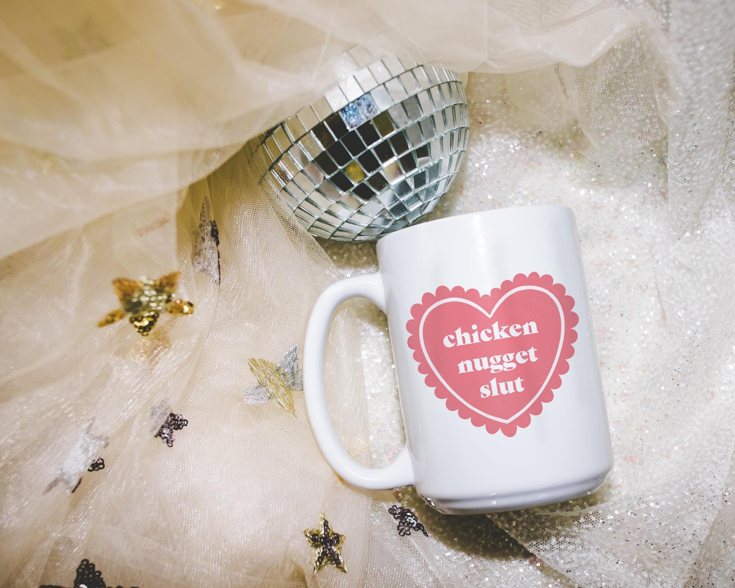 Chicken Nugget Slut Mug | Funny Pink Retro Heart Mug | Dopamine Decor Gift for Her | Sassy Kitsch Coffee Cup |