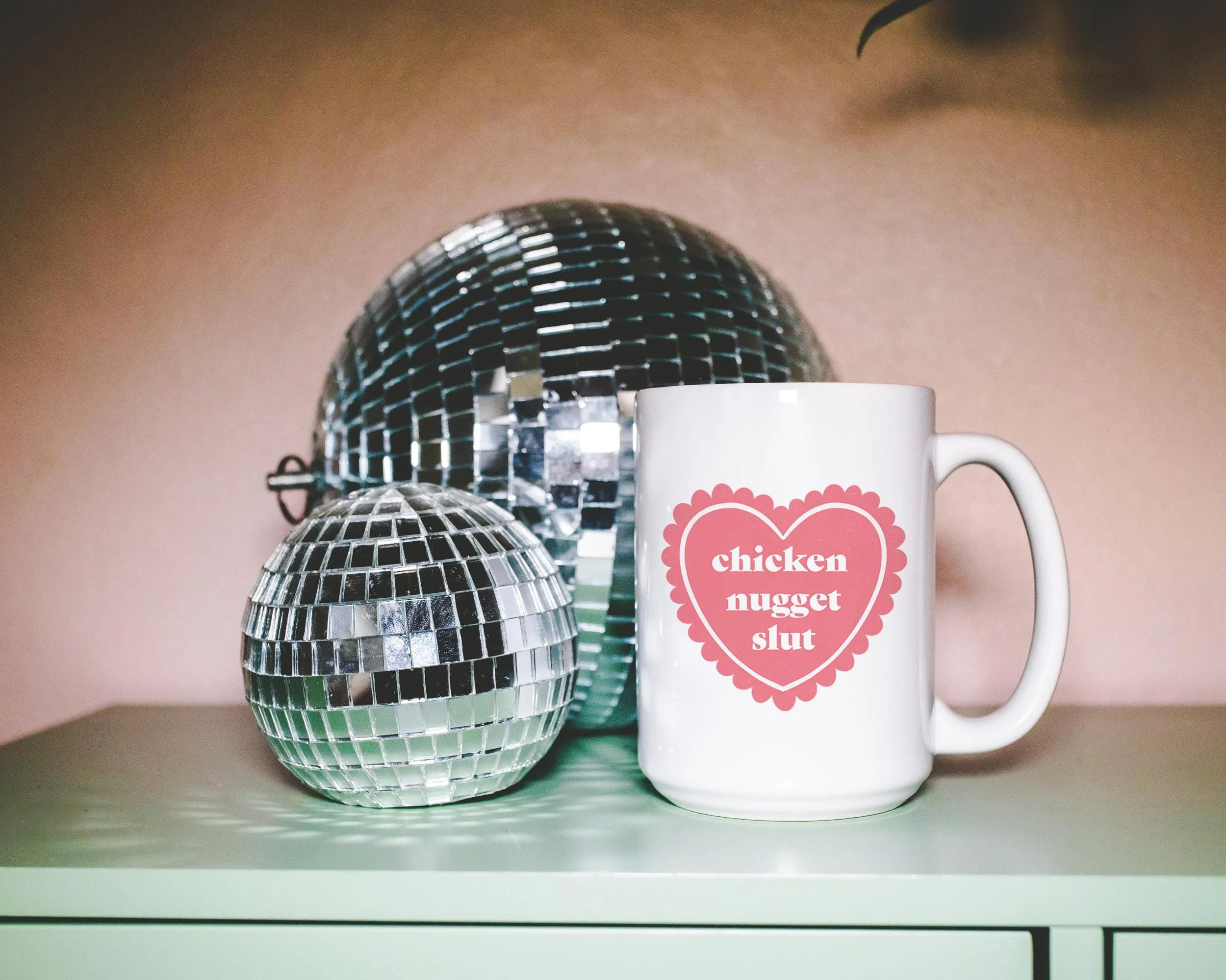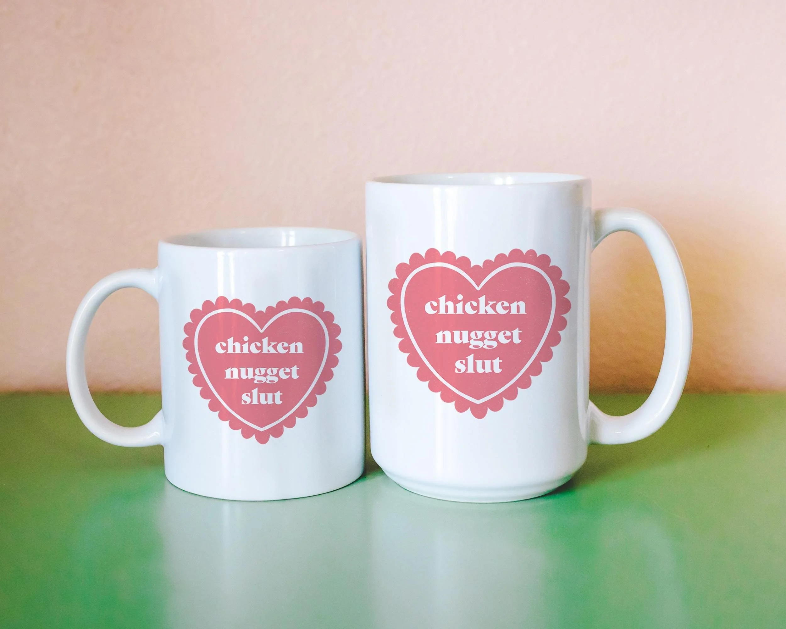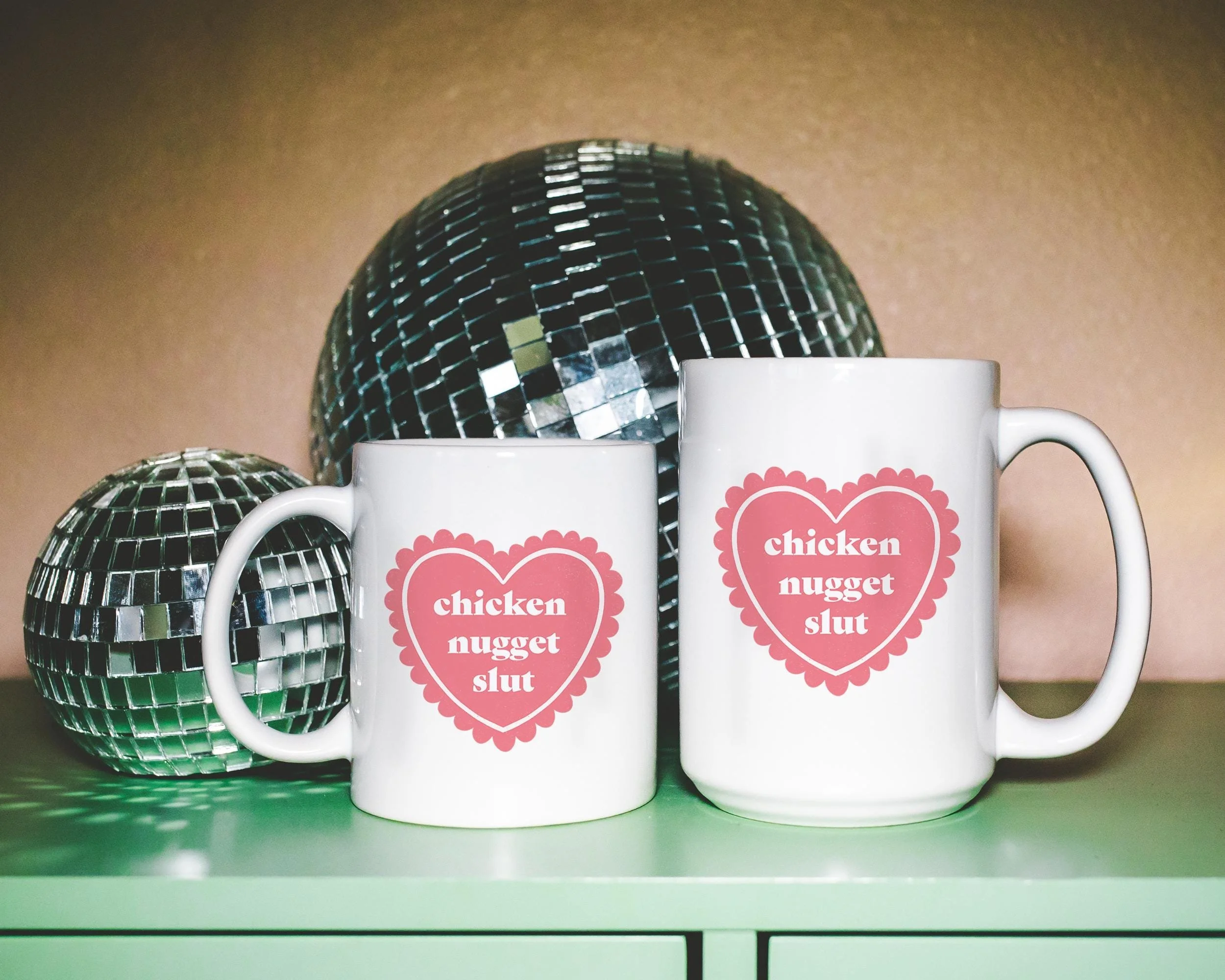 This 11oz/15oz ceramic masterpiece is here to steal your heart (scalloped edges and all). Featuring a bold retro pink heart and the words “Chicken Nugget Slut” in a gloriously cheeky typeface, this mug is perfect for anyone who treats McNuggets like a love language.