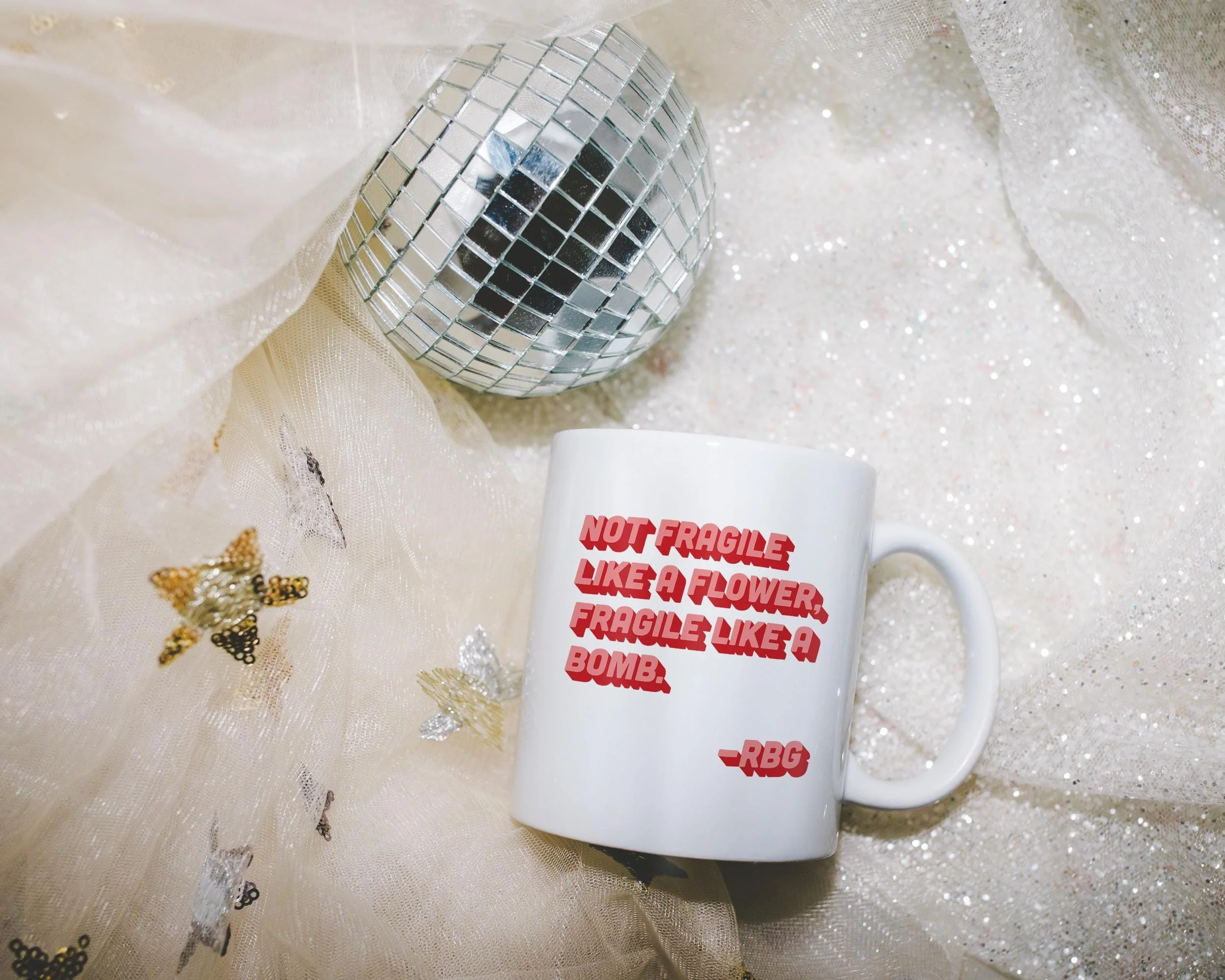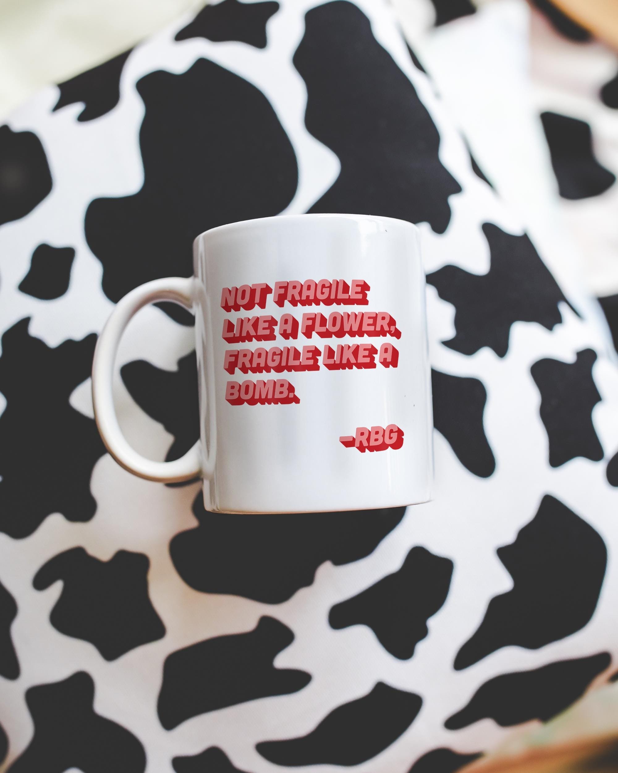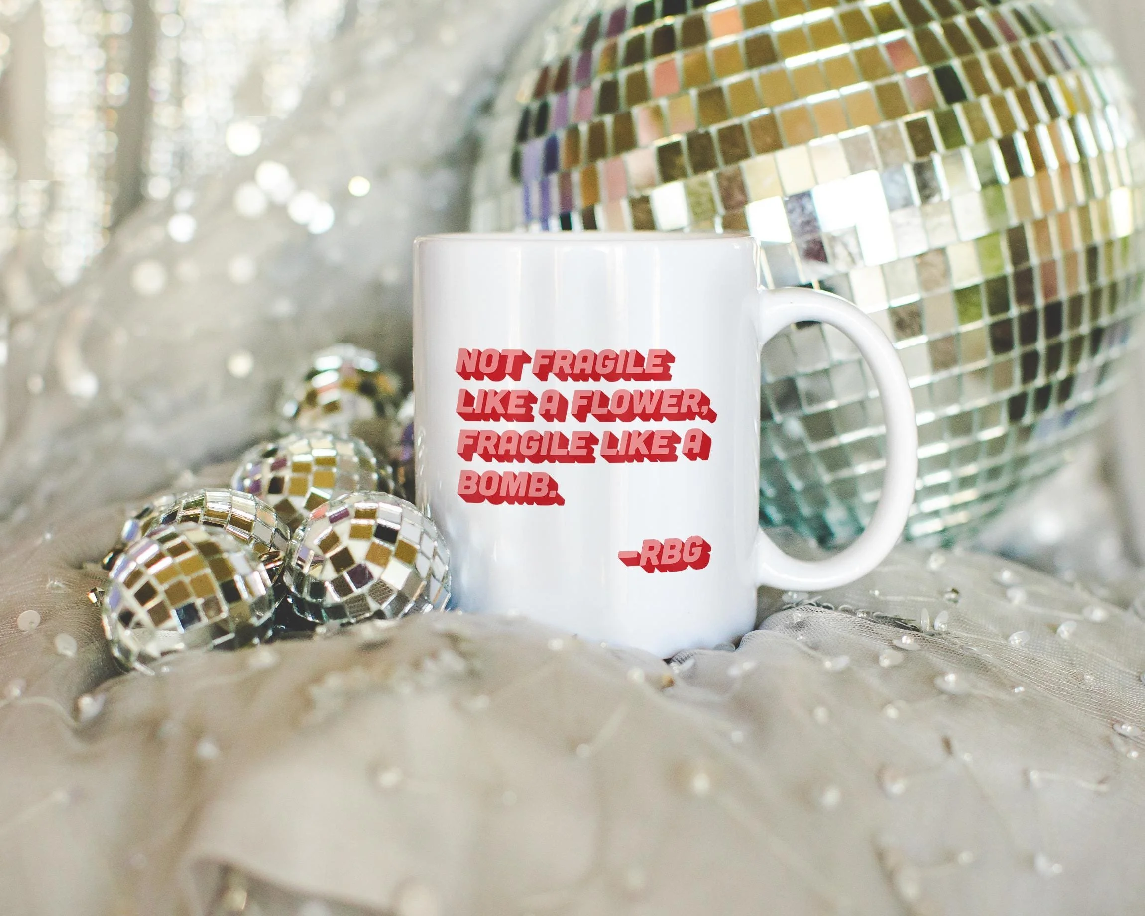 Not Fragile Like a Flower, Fragile Like a Bomb Mug – RBG Quote Mug – Feminist Gift, Bold Typography, Sassy Decor