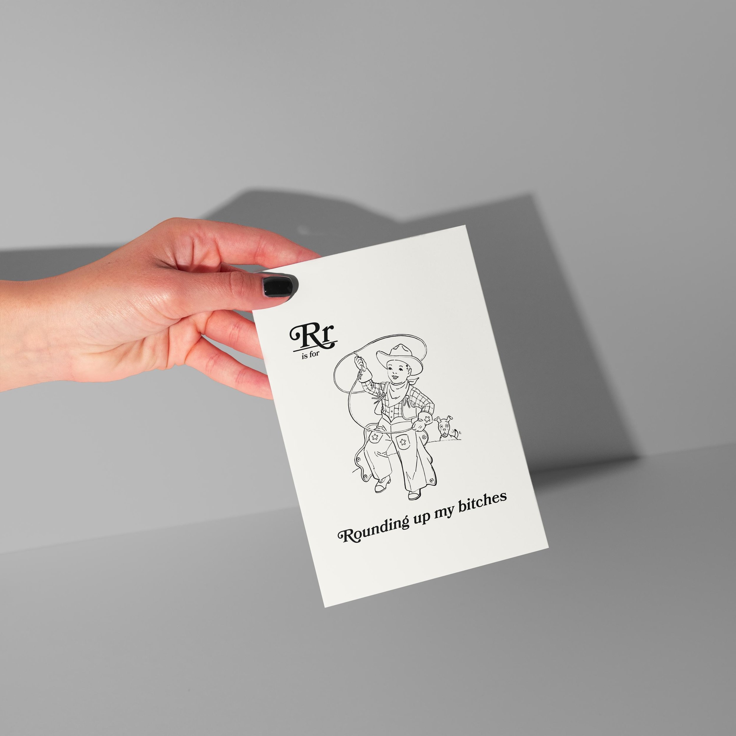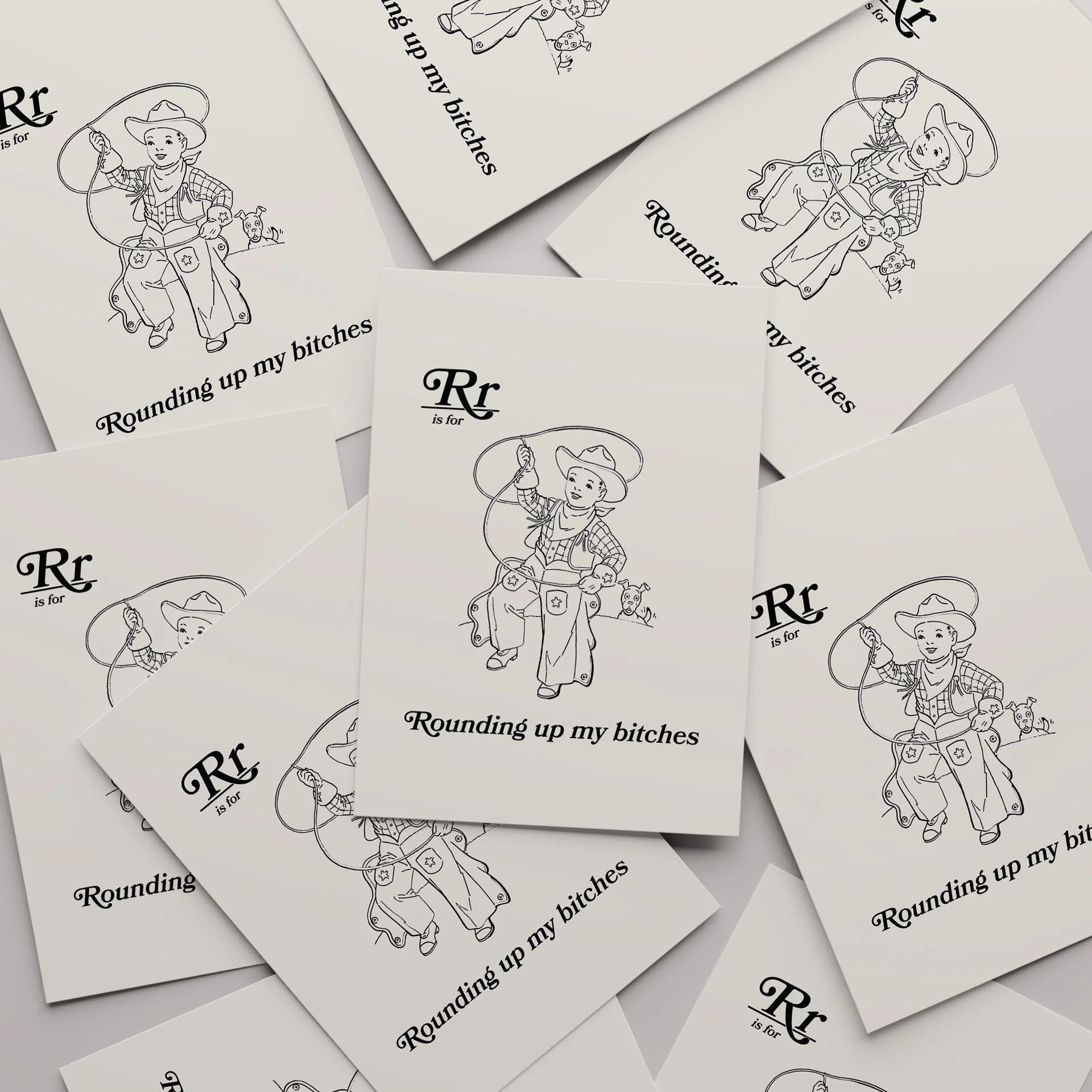 This retro-inspired “R is for Rounding Up My Bitches” wall art print brings the yeehaw energy with a side of sass. Featuring a vintage-style cowboy kid illustration and bold alphabet typography, this black-and-white print is equal parts western-core and winkingly rude — the kind of art that makes people double take (then laugh out loud).