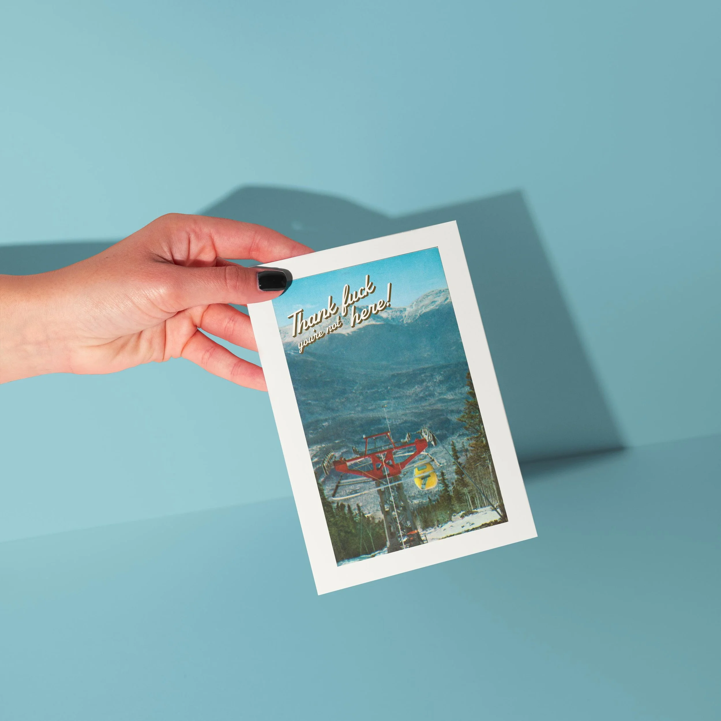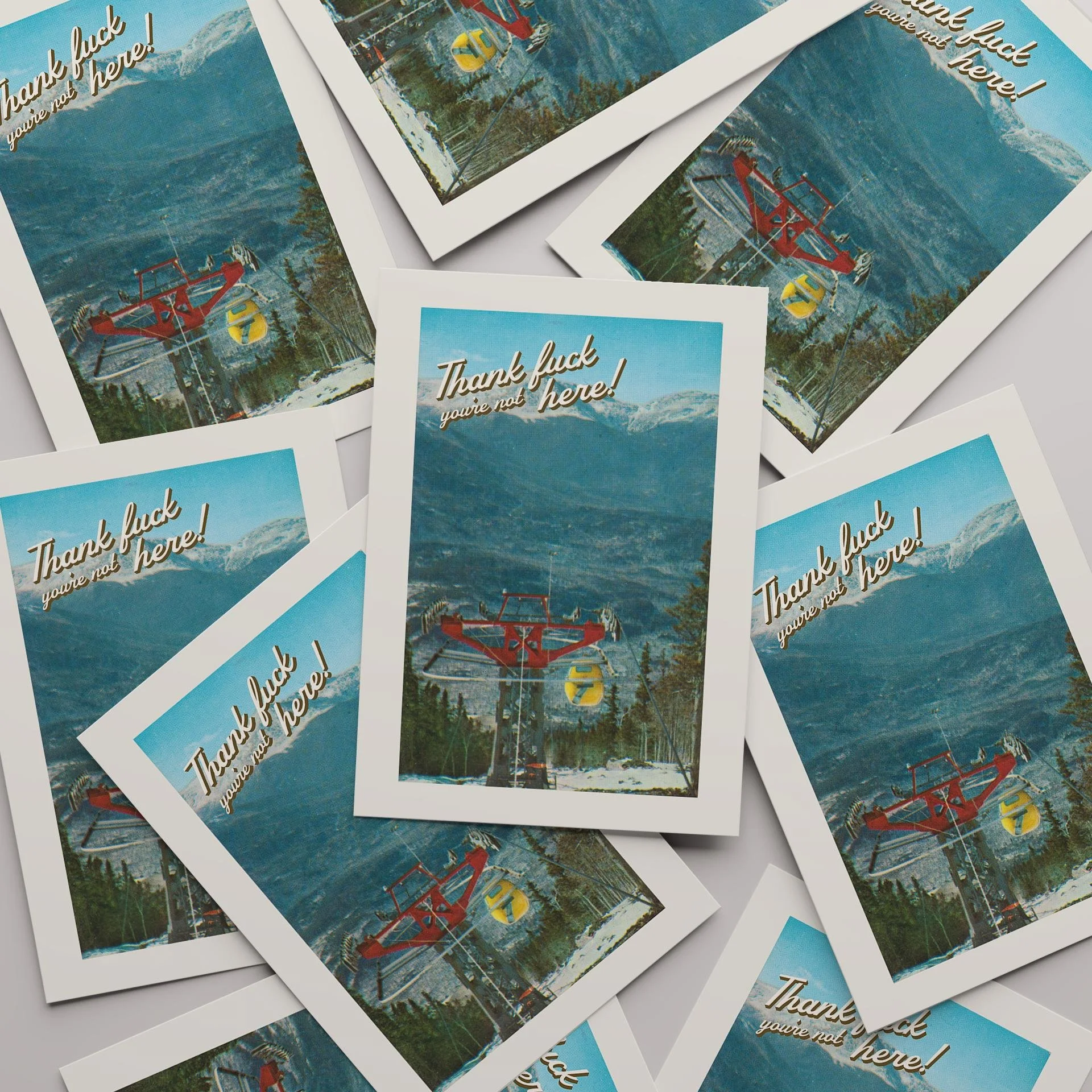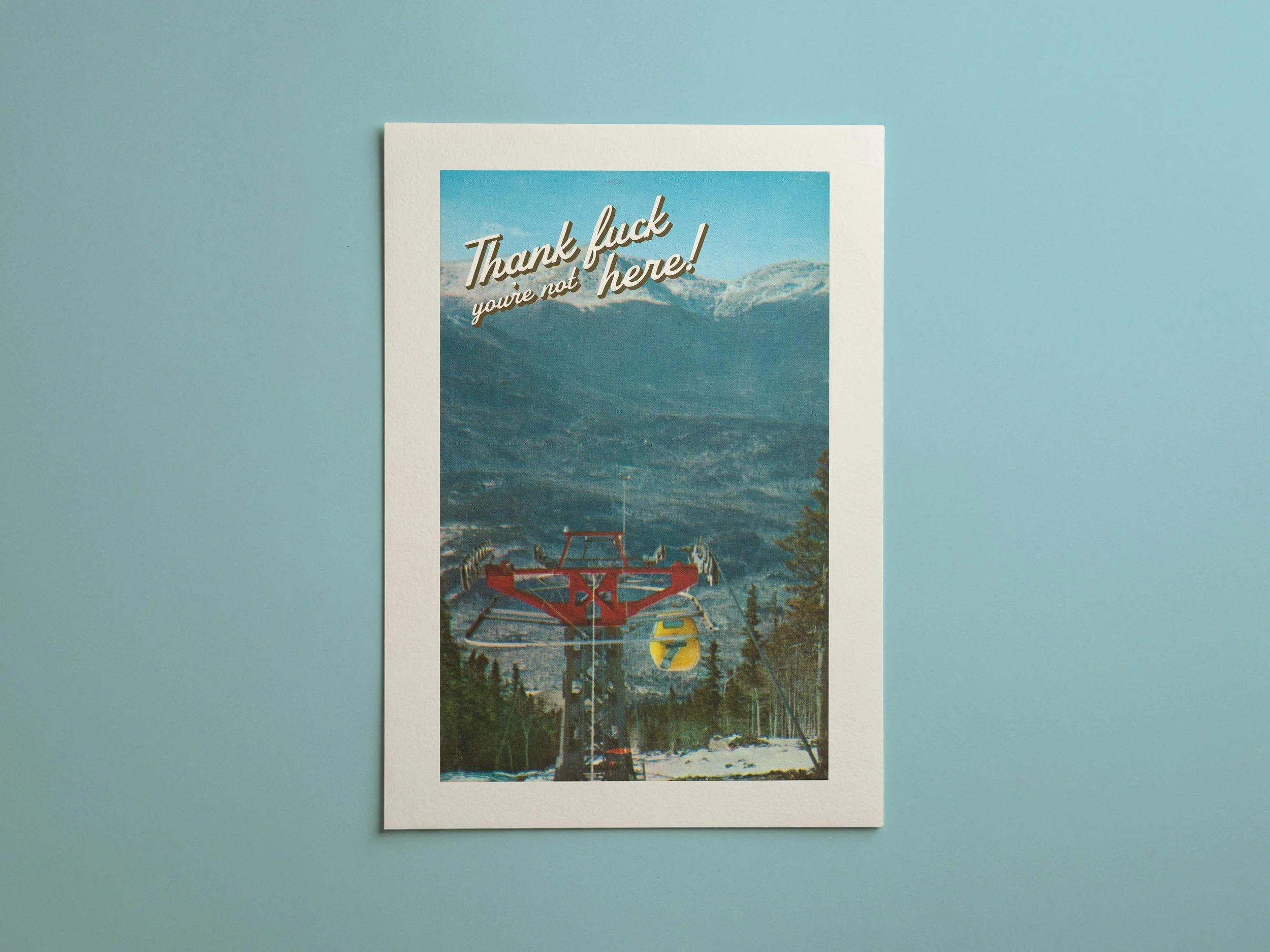 This vintage postcard-style art print delivers the ultimate anti-greeting. Featuring a dreamy ski-lift mountain scene straight out of a ‘70s travel brochure — overlaid with the brutally honest message: “Thank f*ck you’re not here!” — it’s the perfect piece for anyone who loves humour as dry as the air in Aspen.