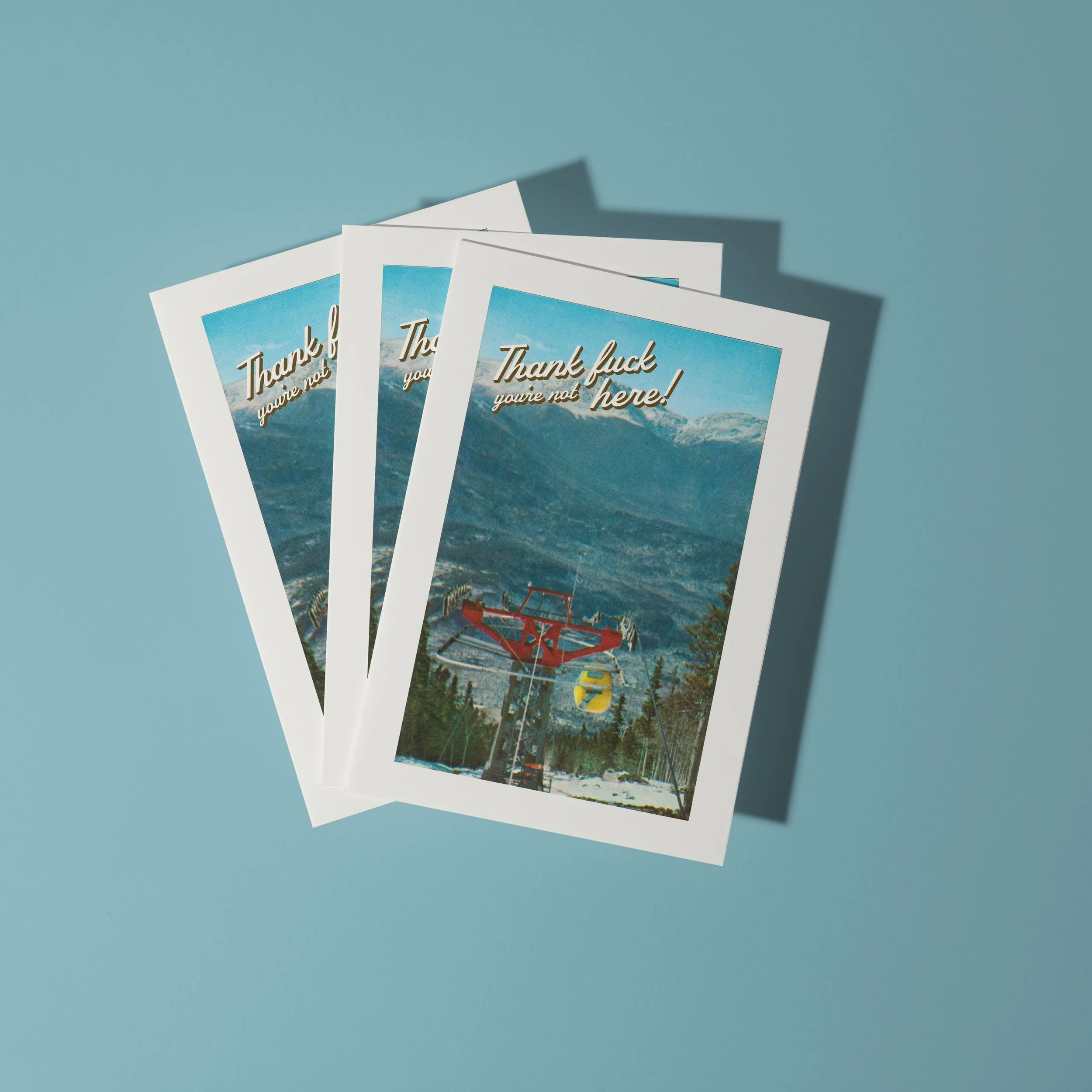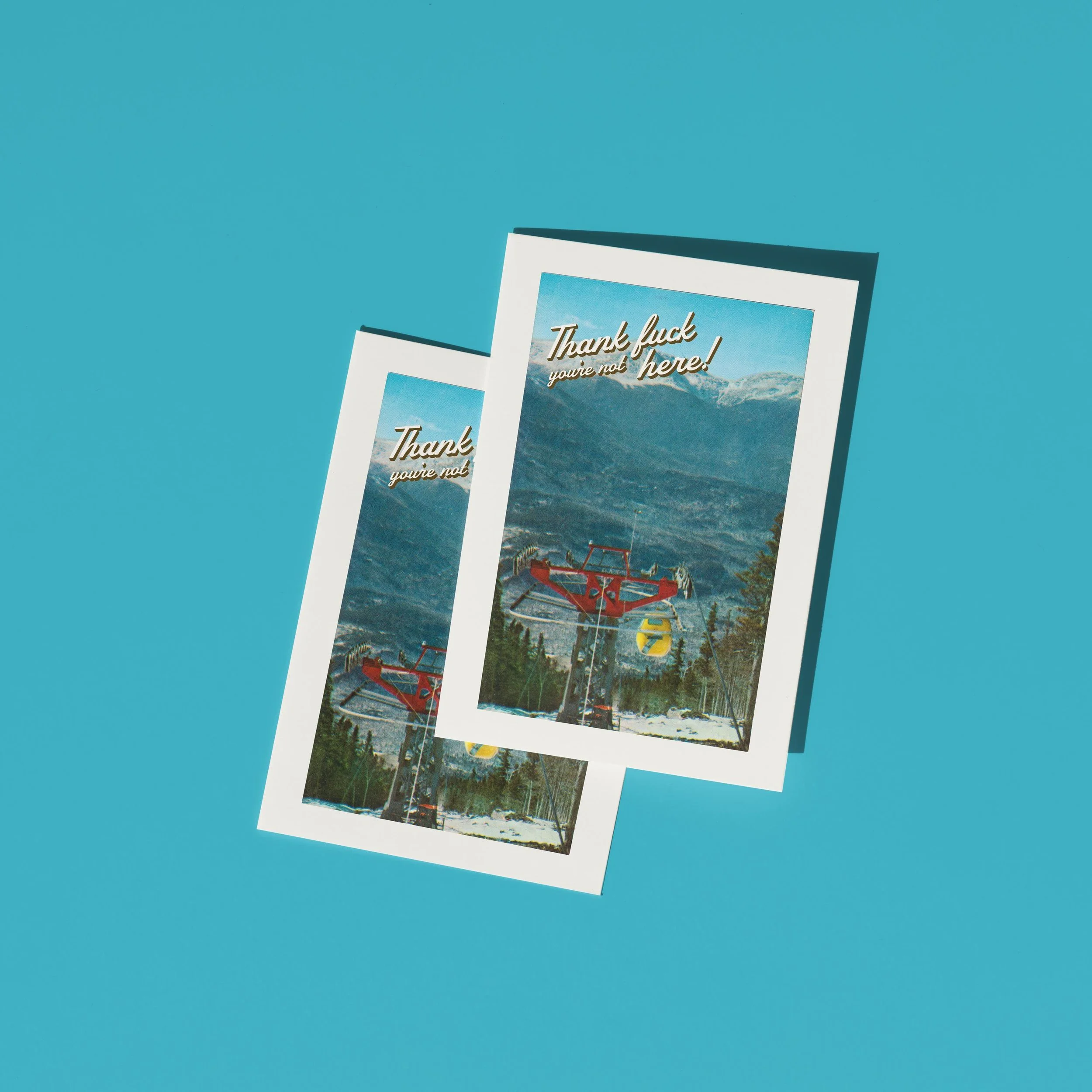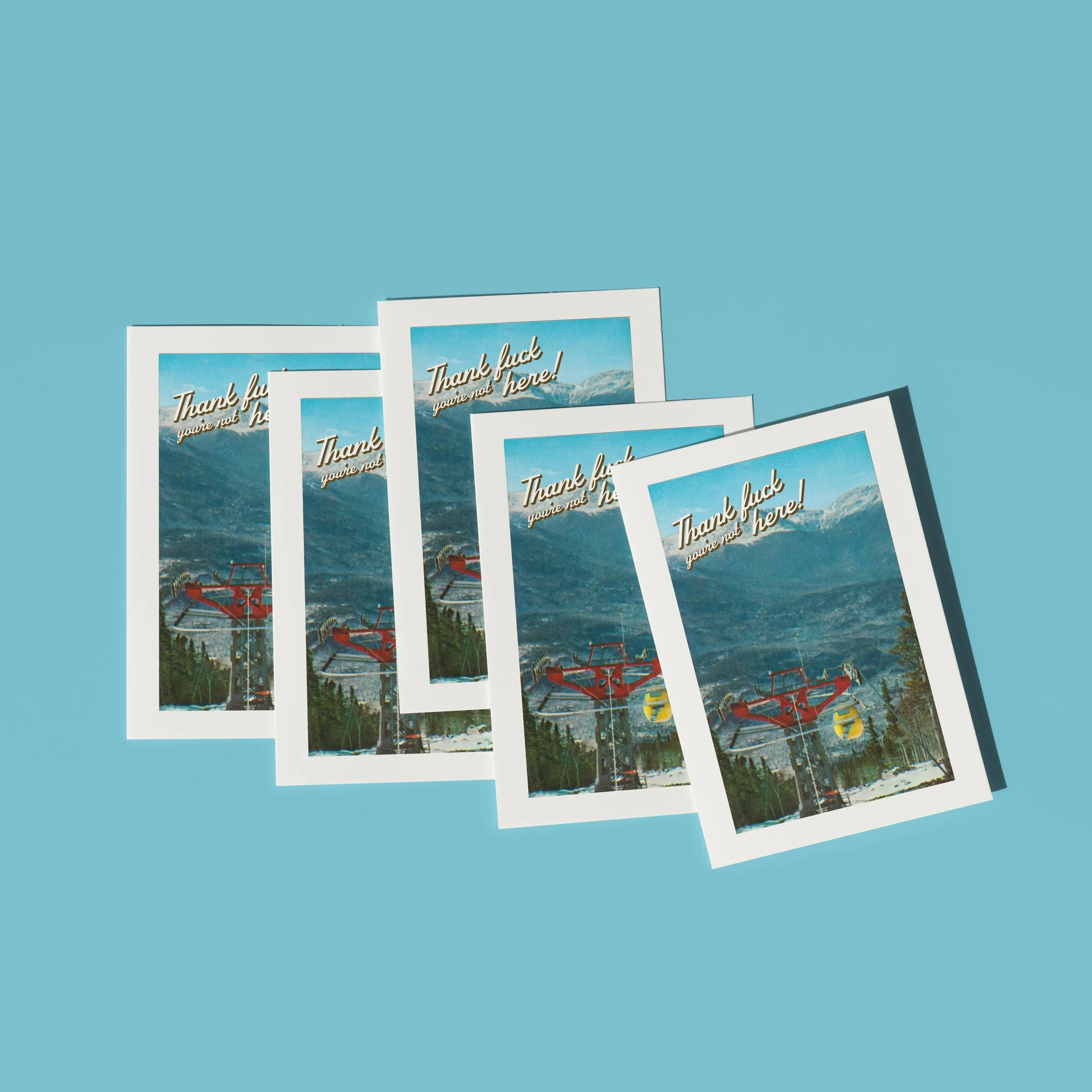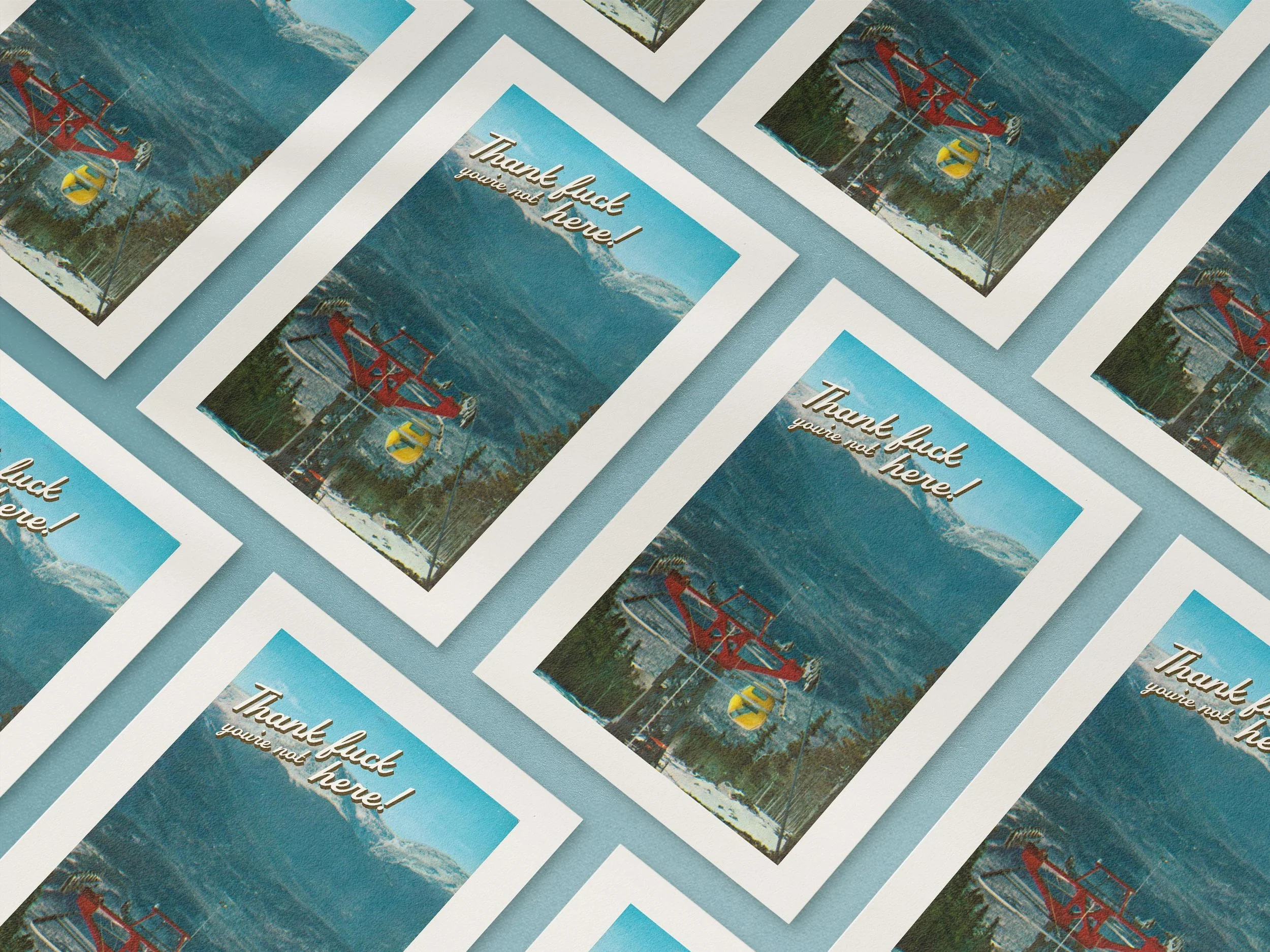 This vintage postcard-style art print delivers the ultimate anti-greeting. Featuring a dreamy ski-lift mountain scene straight out of a ‘70s travel brochure — overlaid with the brutally honest message: “Thank f*ck you’re not here!” — it’s the perfect piece for anyone who loves humour as dry as the air in Aspen.