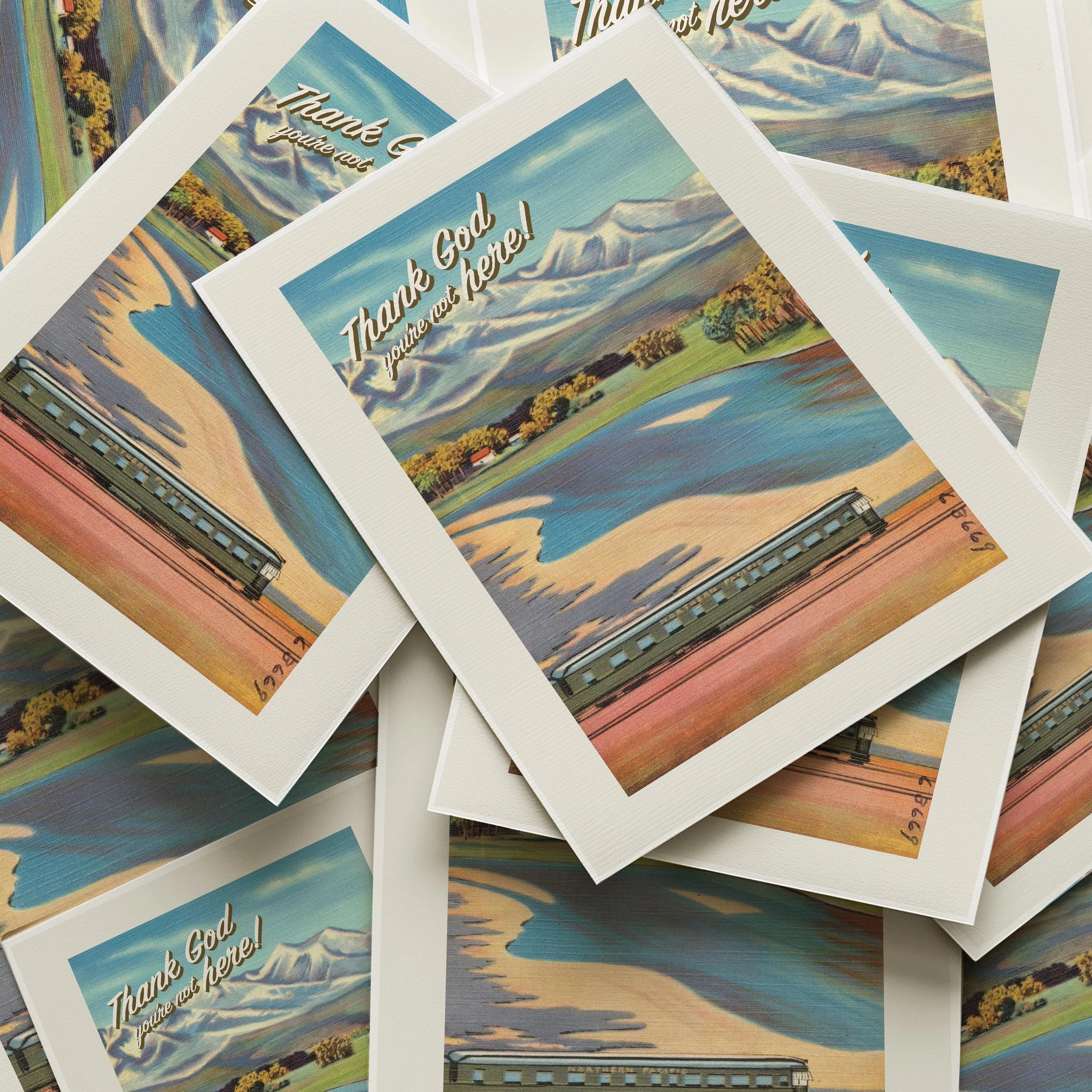 Say it with style (and a sprinkle of sass) — this “Thank God You’re Not Here” art print is a tongue-in-cheek take on vintage travel posters. With a dreamy mountain backdrop, pastel skies, and a lonely train making a quick getaway, it’s giving "wish you weren’t here" energy in the prettiest way possible.