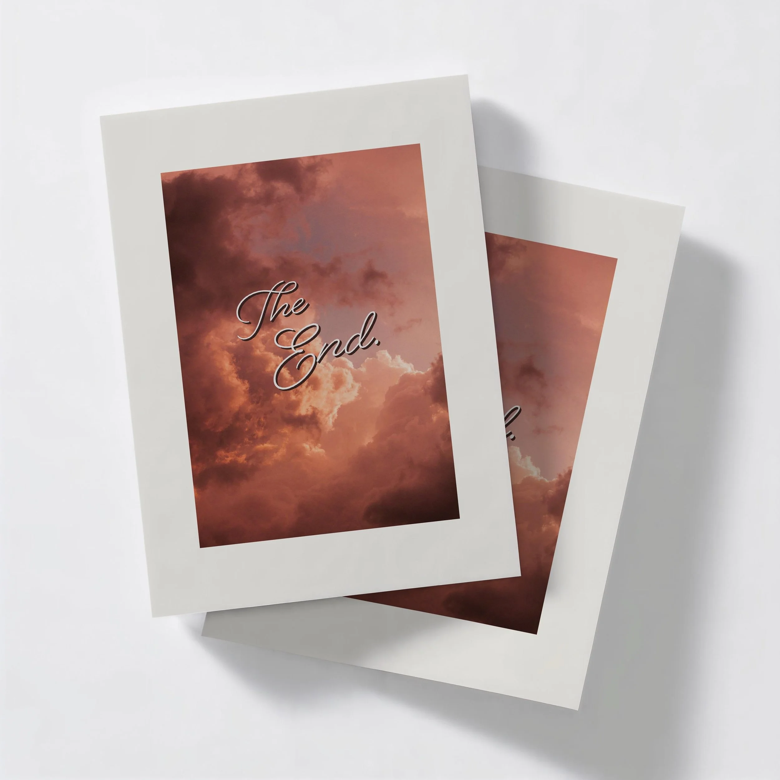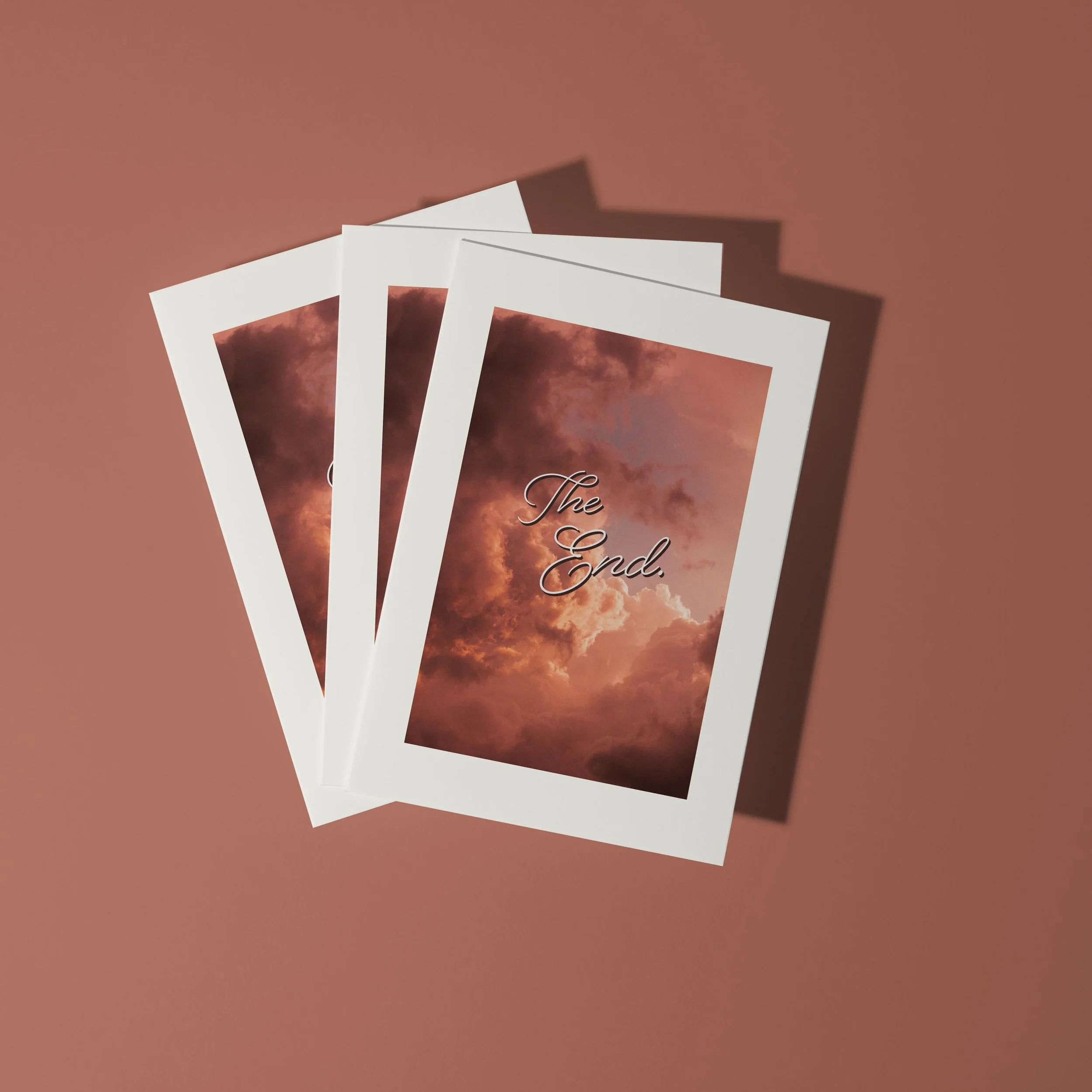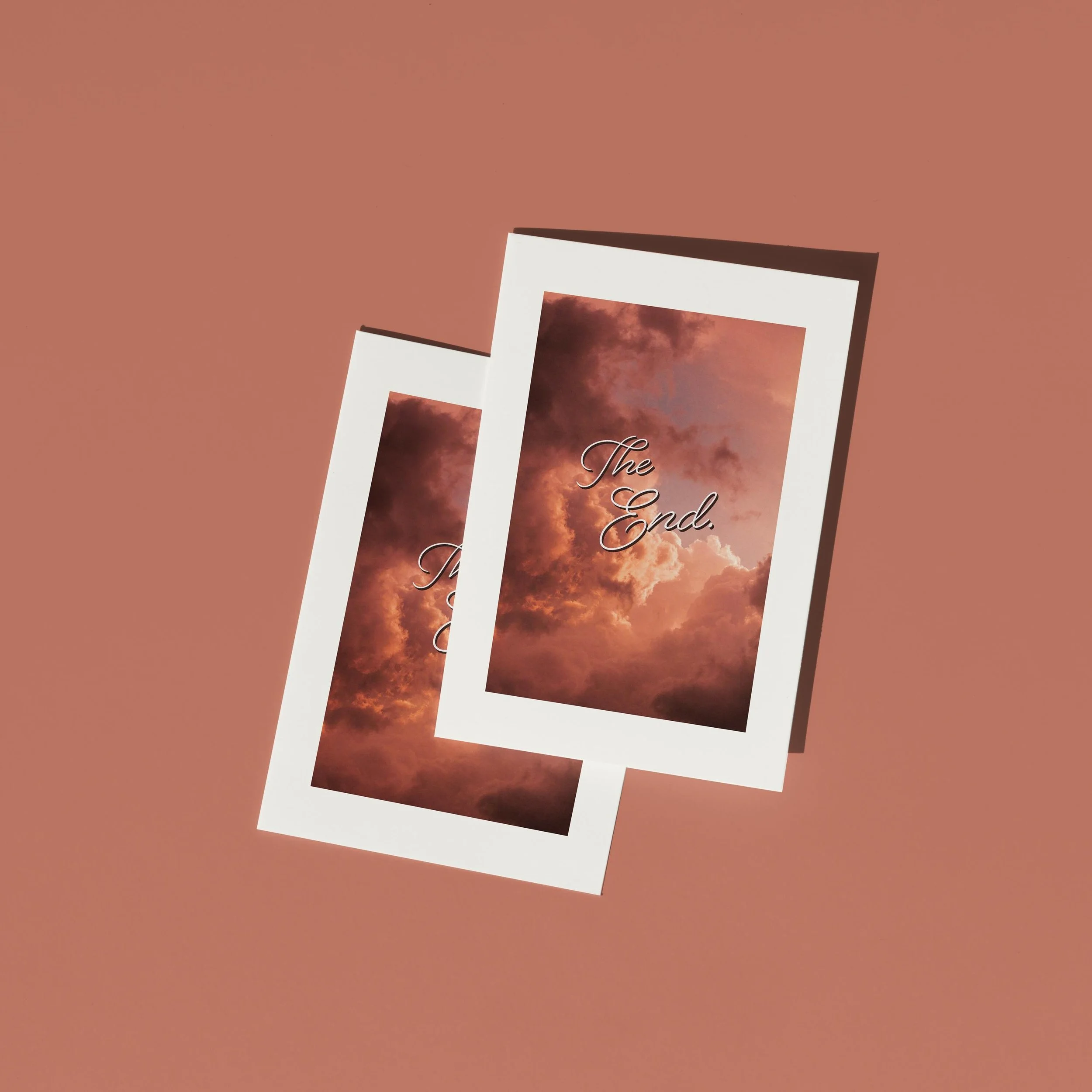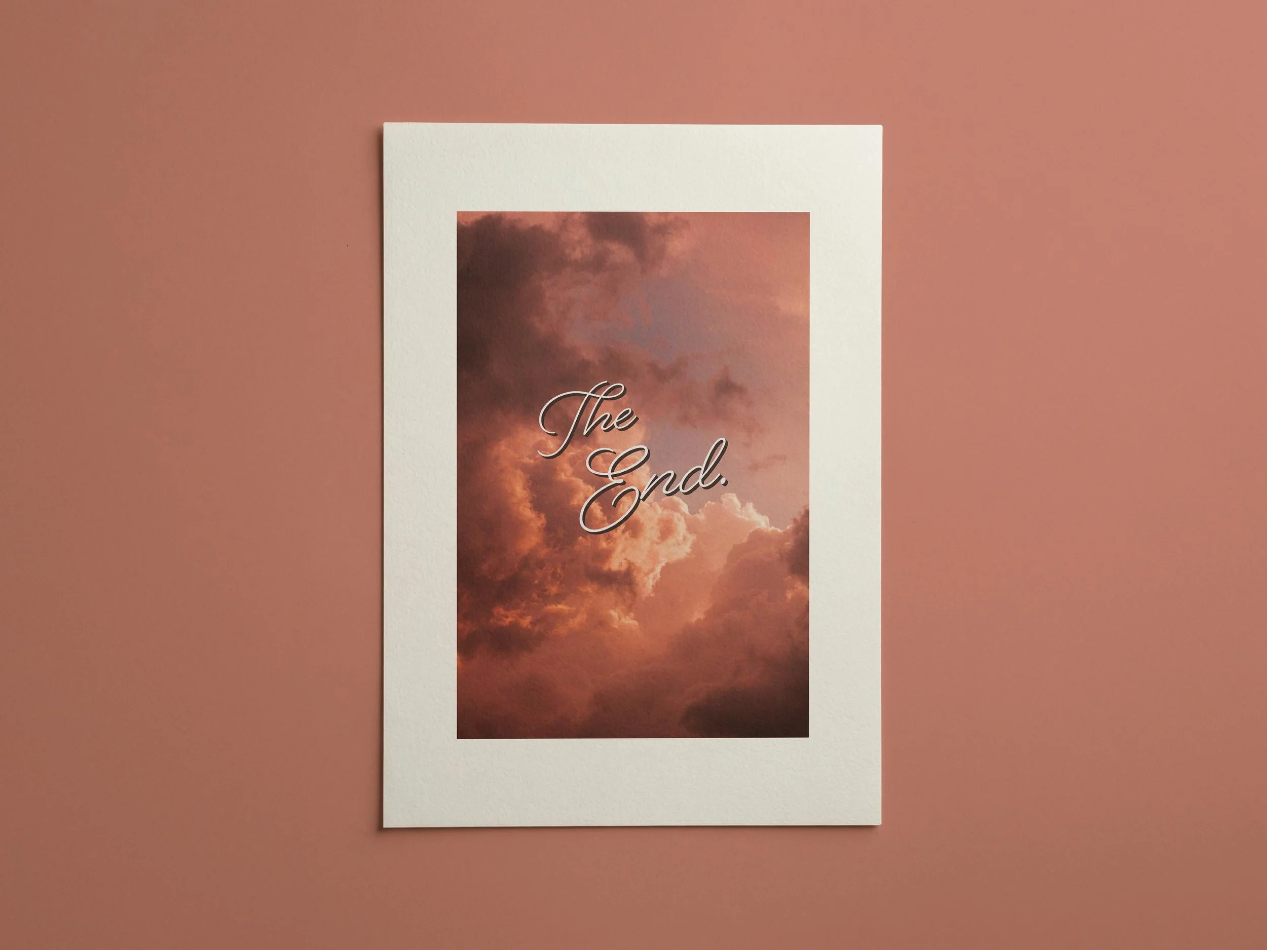 This warm, cinematic print is perfect for anyone who wants their walls to look like the final scene of a retro romance movie. A moody swirl of pink-orange clouds sets the backdrop for elegant cursive text that simply says: The End.