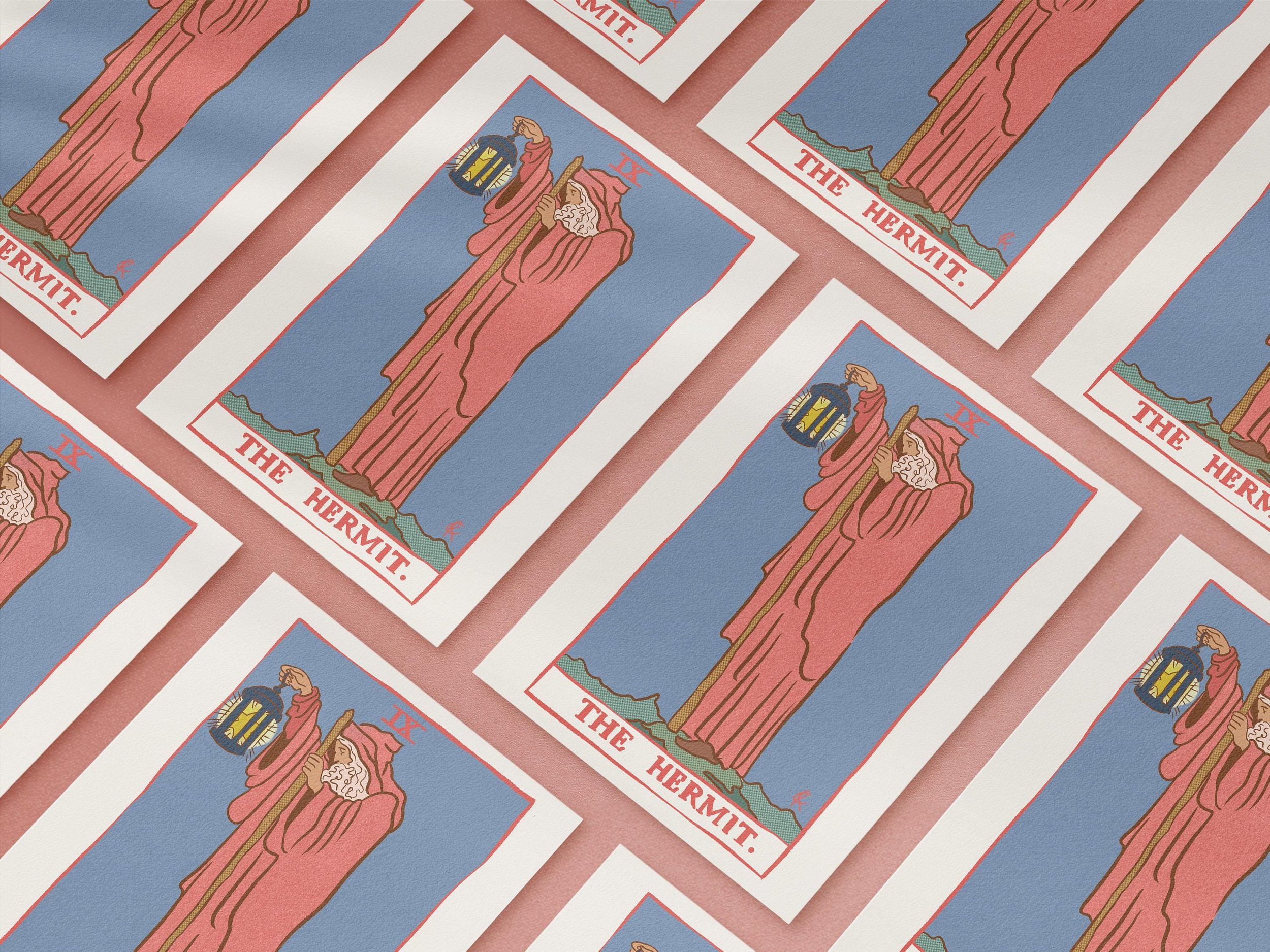 This The Hermit tarot card print is for those in their quiet era — embracing solitude, inner wisdom, and not texting back. With its bold retro-inspired design in muted reds, deep blue, and golden lantern glow, this art print reminds you that isolation isn’t lonely — it’s sacred.