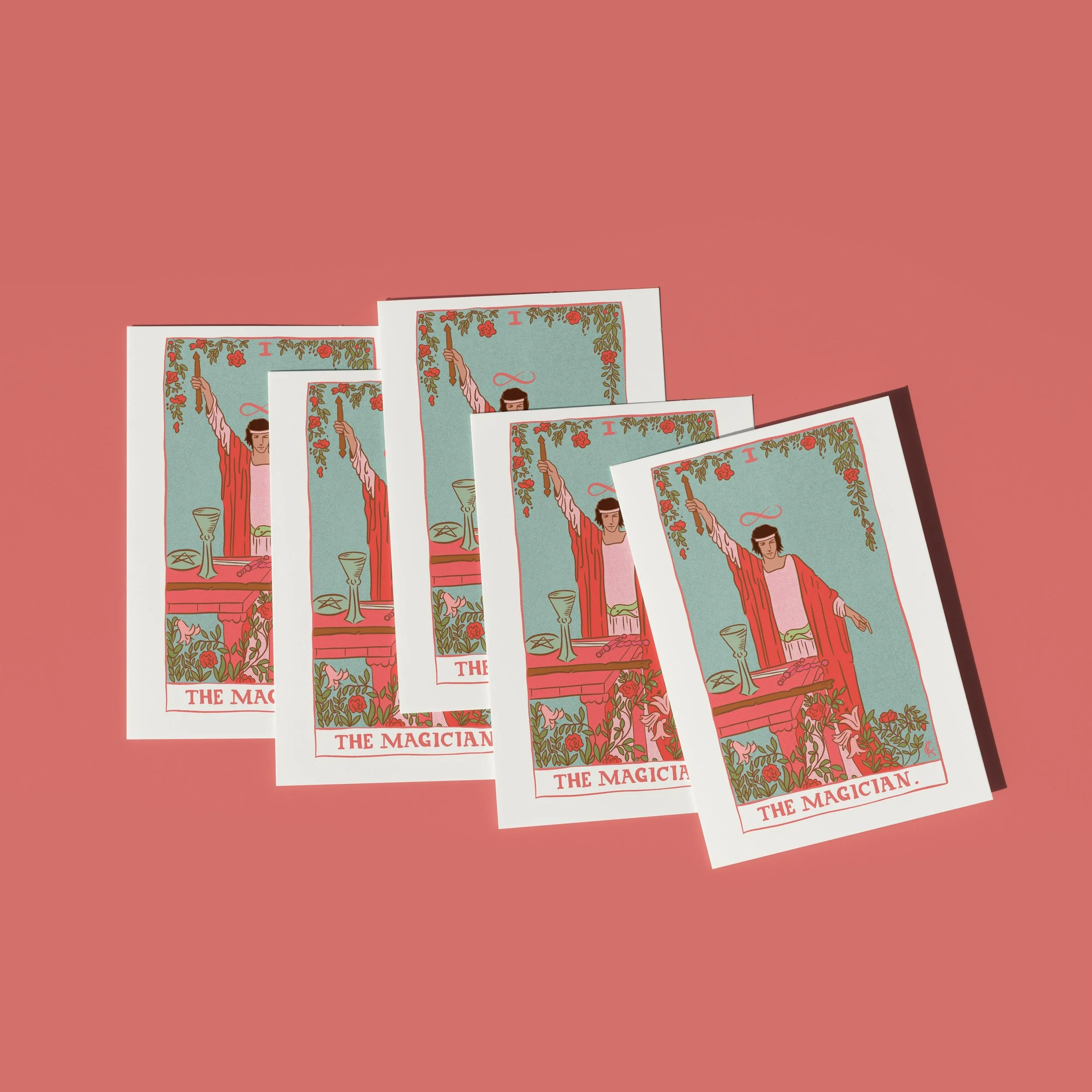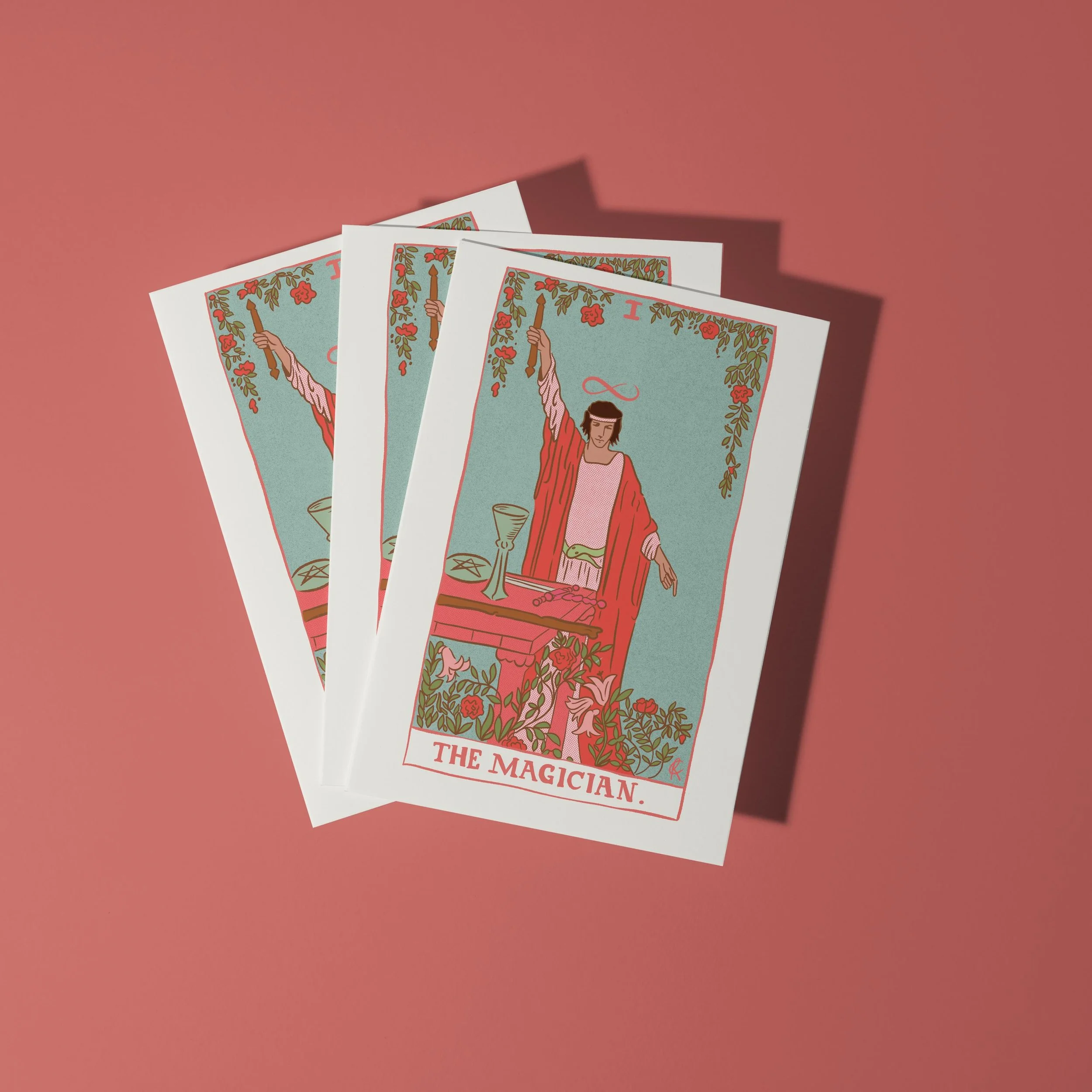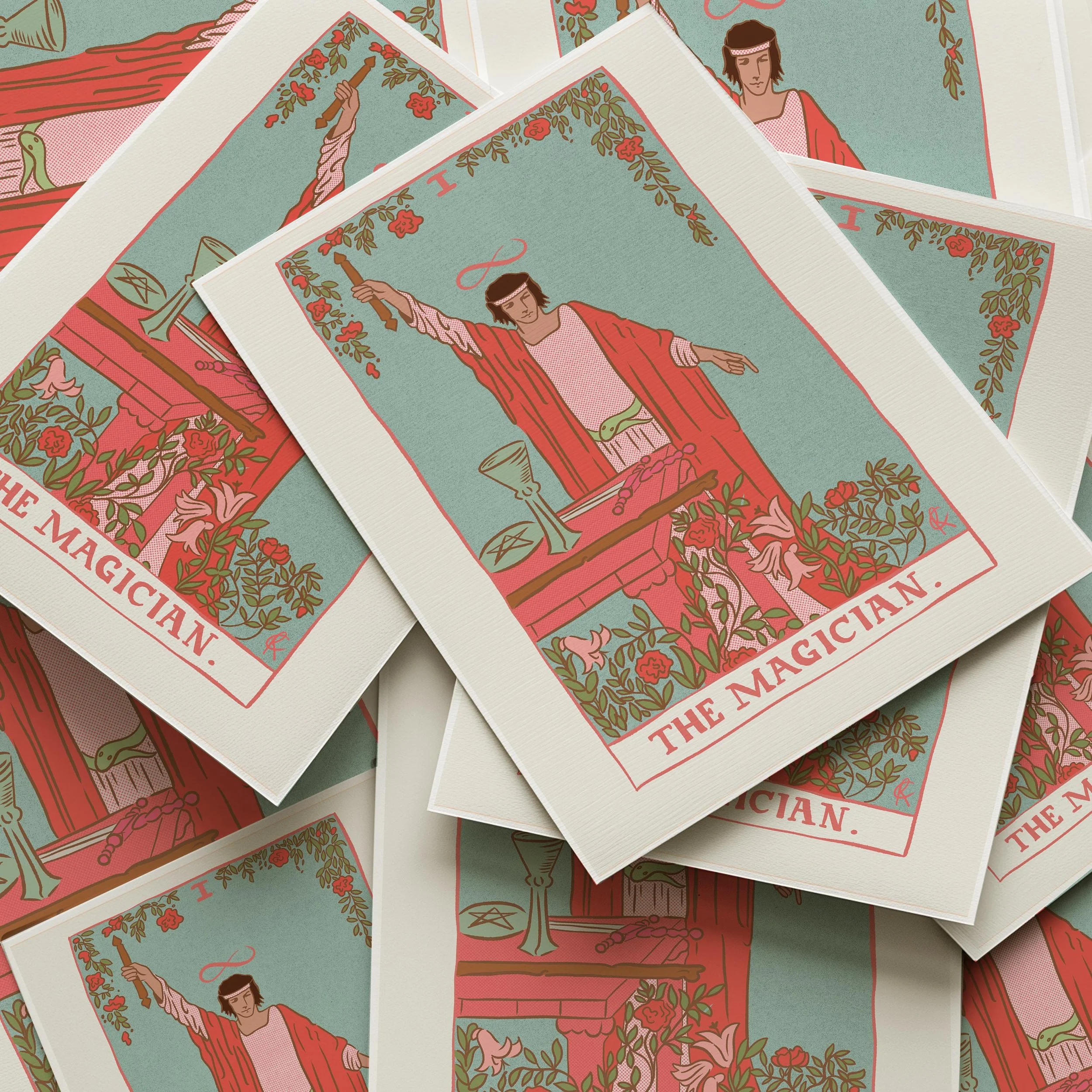 This The Magician tarot card print is your daily affirmation in art form: you are the spell. Channeling Major Arcana energy and a dreamy retro aesthetic, this print is packed with intention. Featuring soft mint, coral red, and playful pink tones, it brings manifestation vibes to your space.
