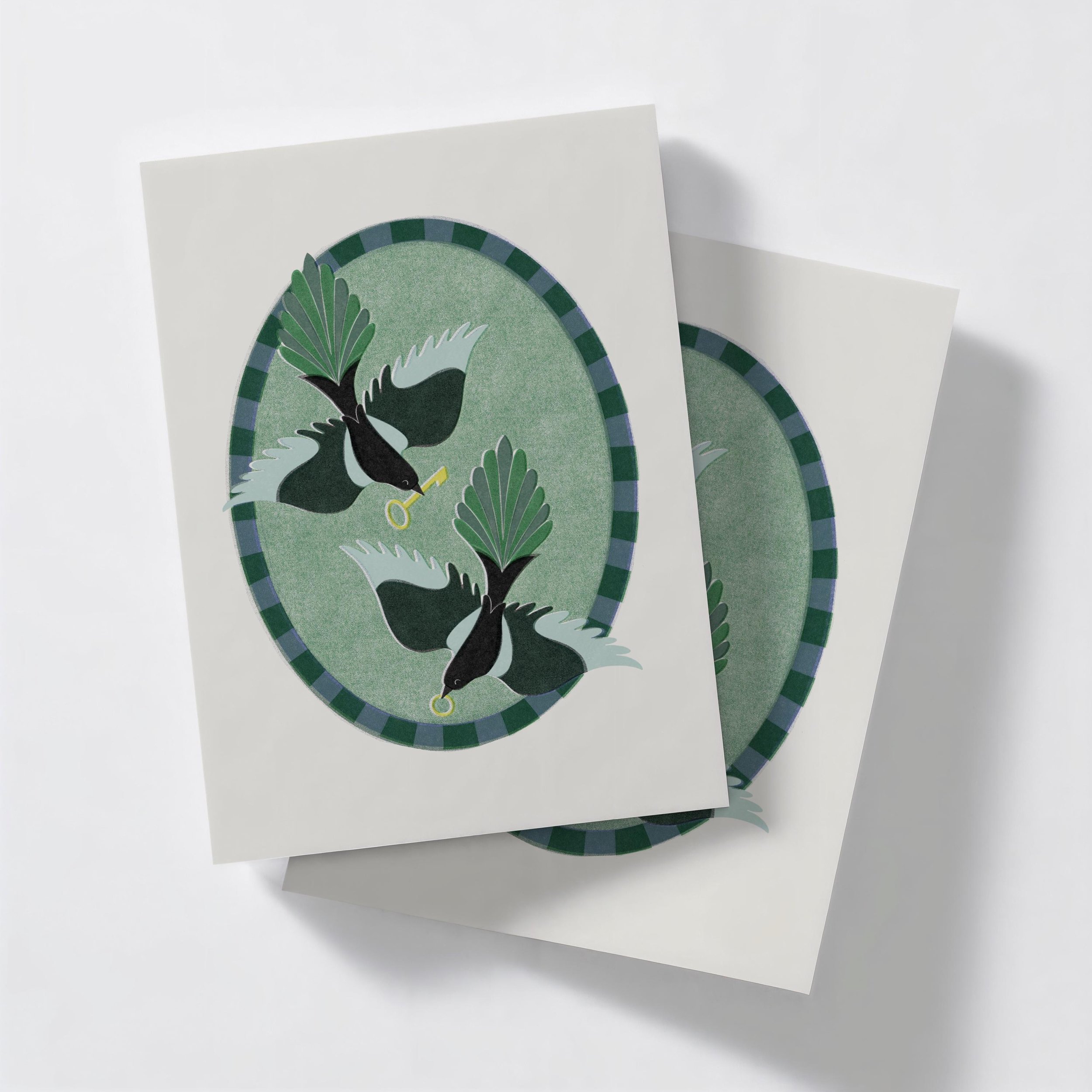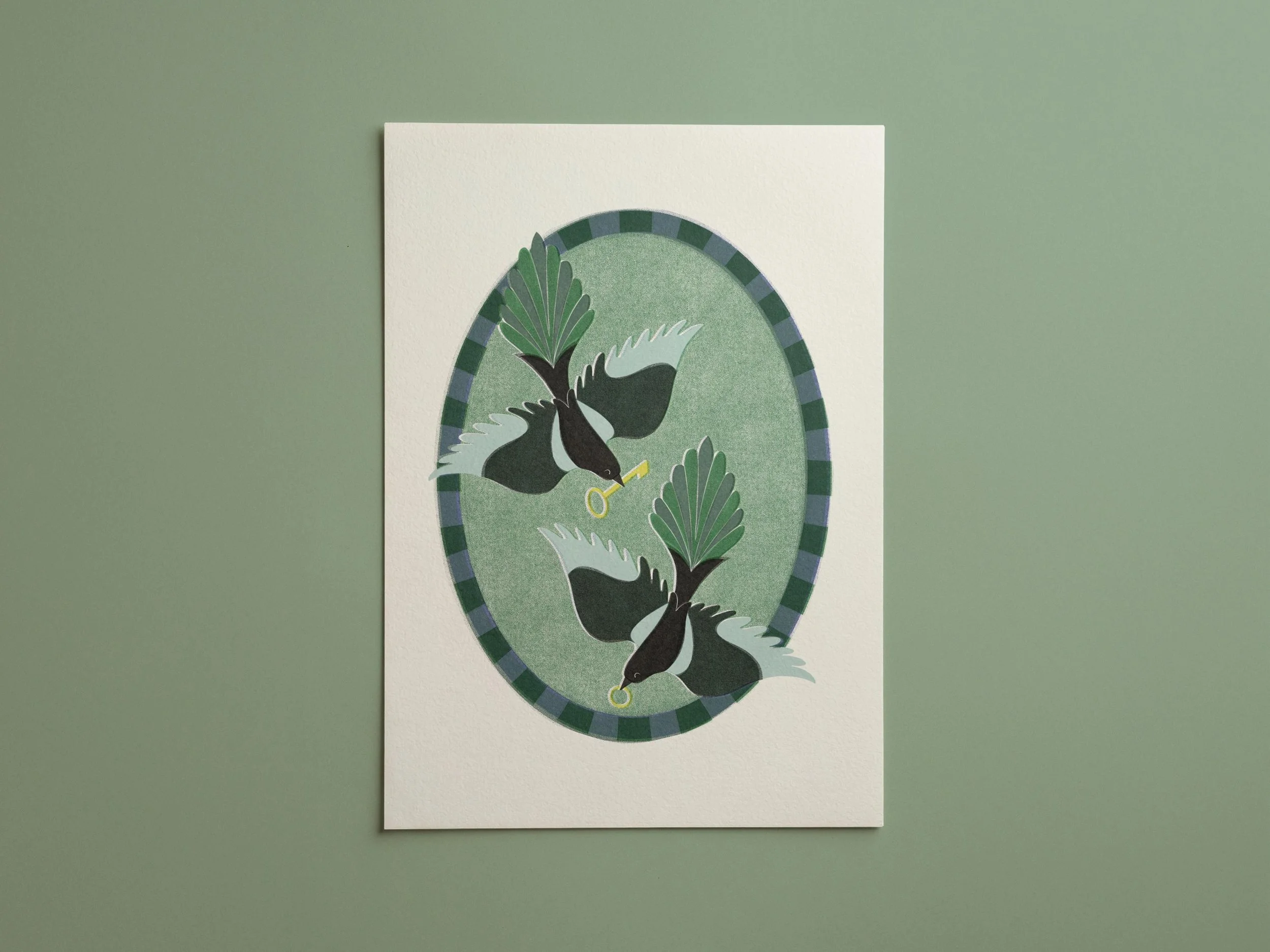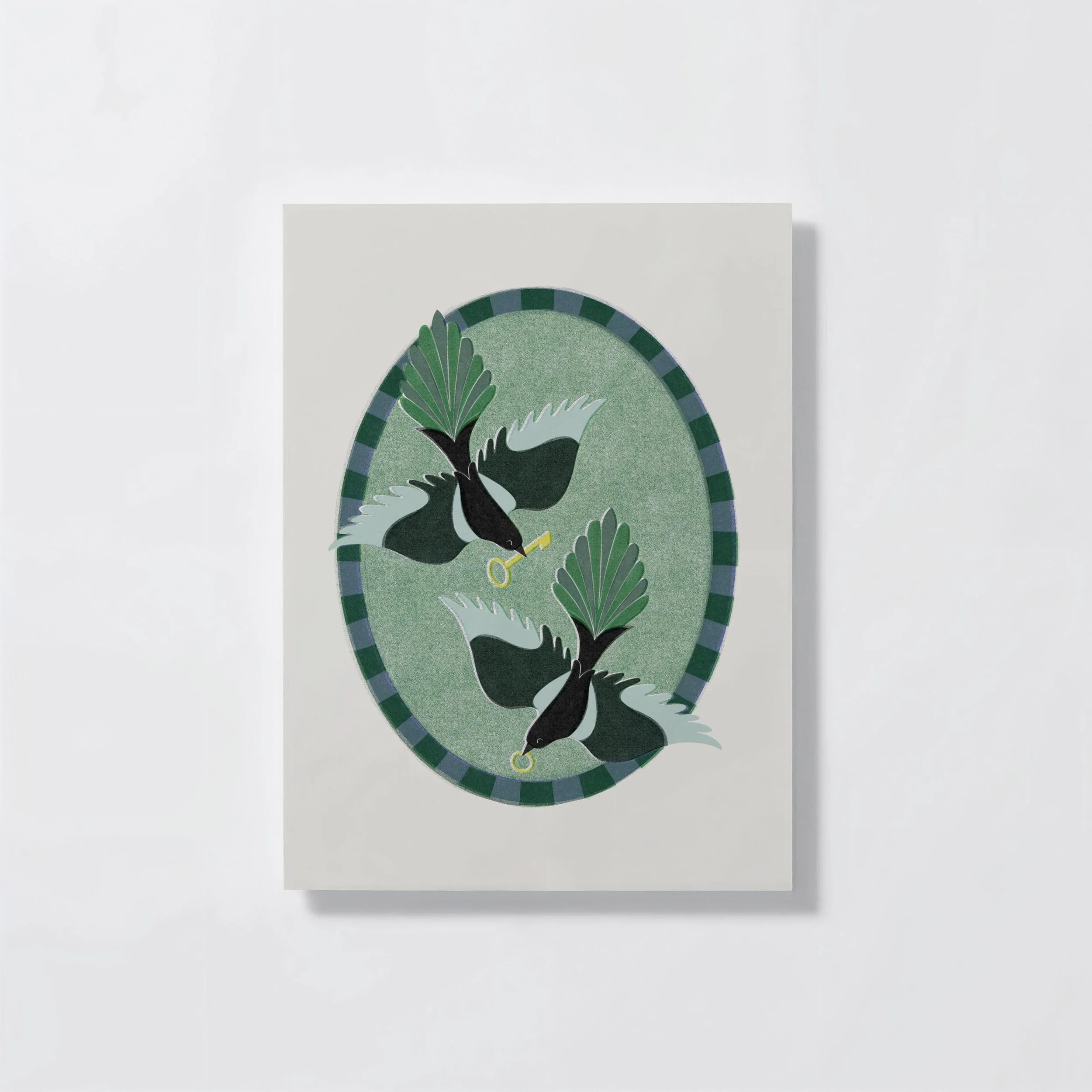 This graphic folk-inspired print features a mirrored pair of magpies clutching golden rings and keys, surrounded by a lush green palette and retro oval frame. A nod to the iconic rhyme (“One for sorrow, two for joy”), this one’s for the hopeful, the whimsical, and the slightly superstitious.