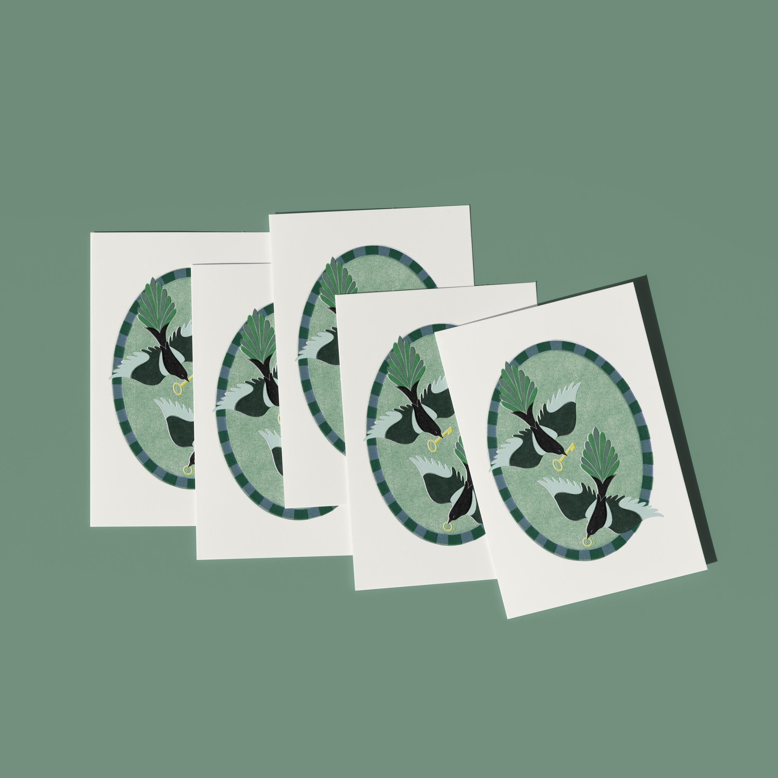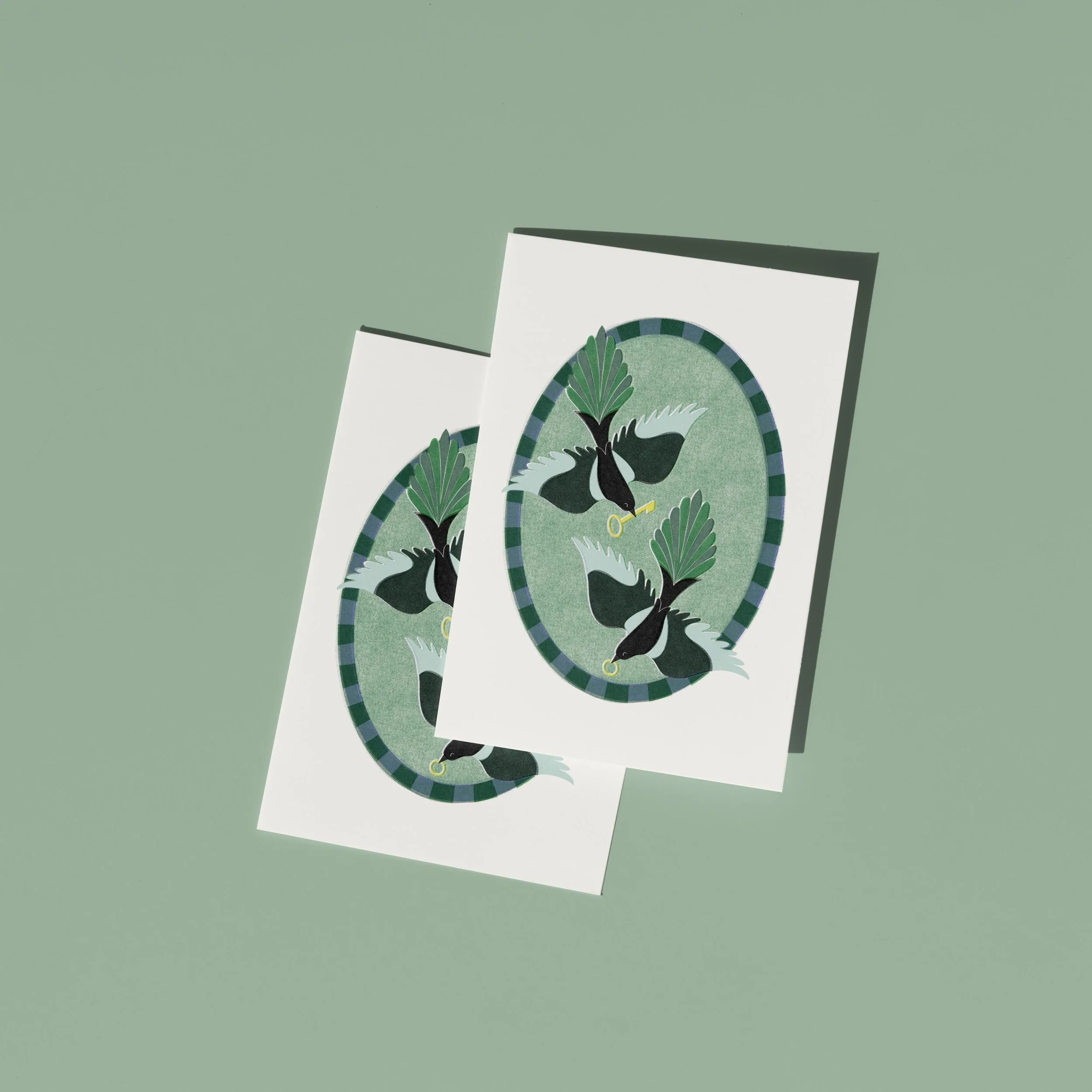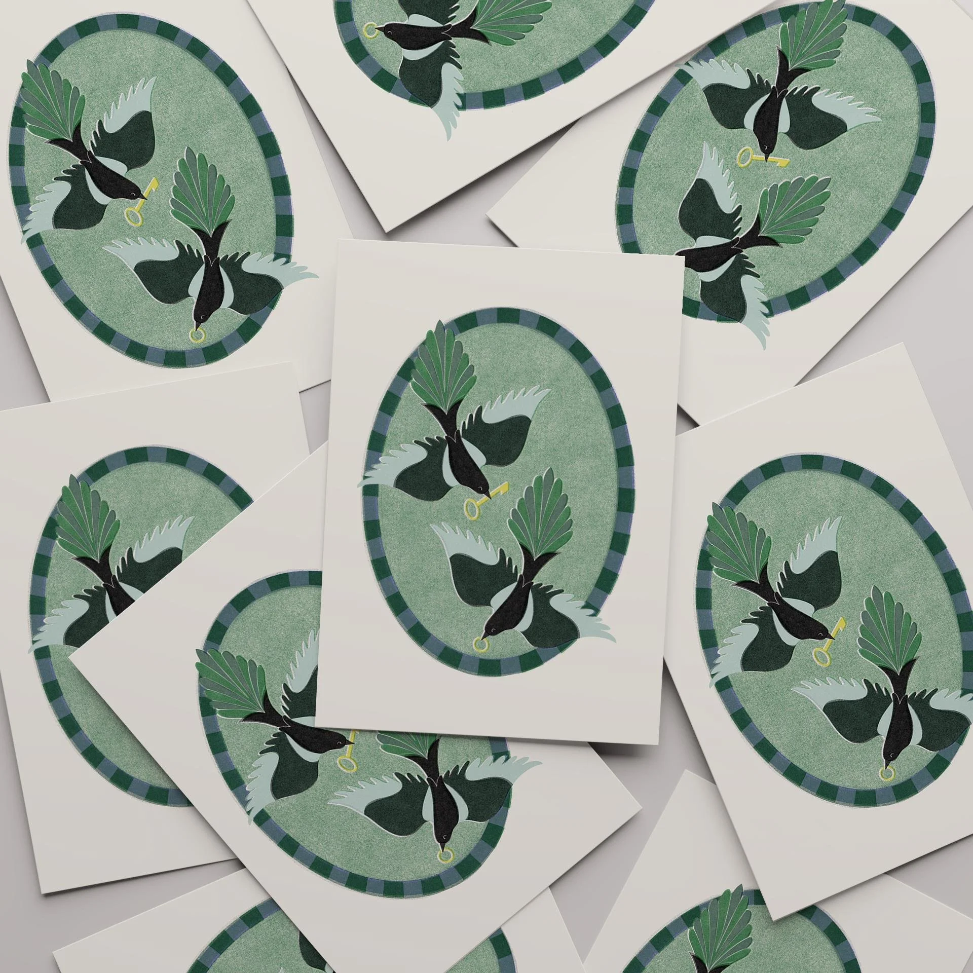 This graphic folk-inspired print features a mirrored pair of magpies clutching golden rings and keys, surrounded by a lush green palette and retro oval frame. A nod to the iconic rhyme (“One for sorrow, two for joy”), this one’s for the hopeful, the whimsical, and the slightly superstitious.